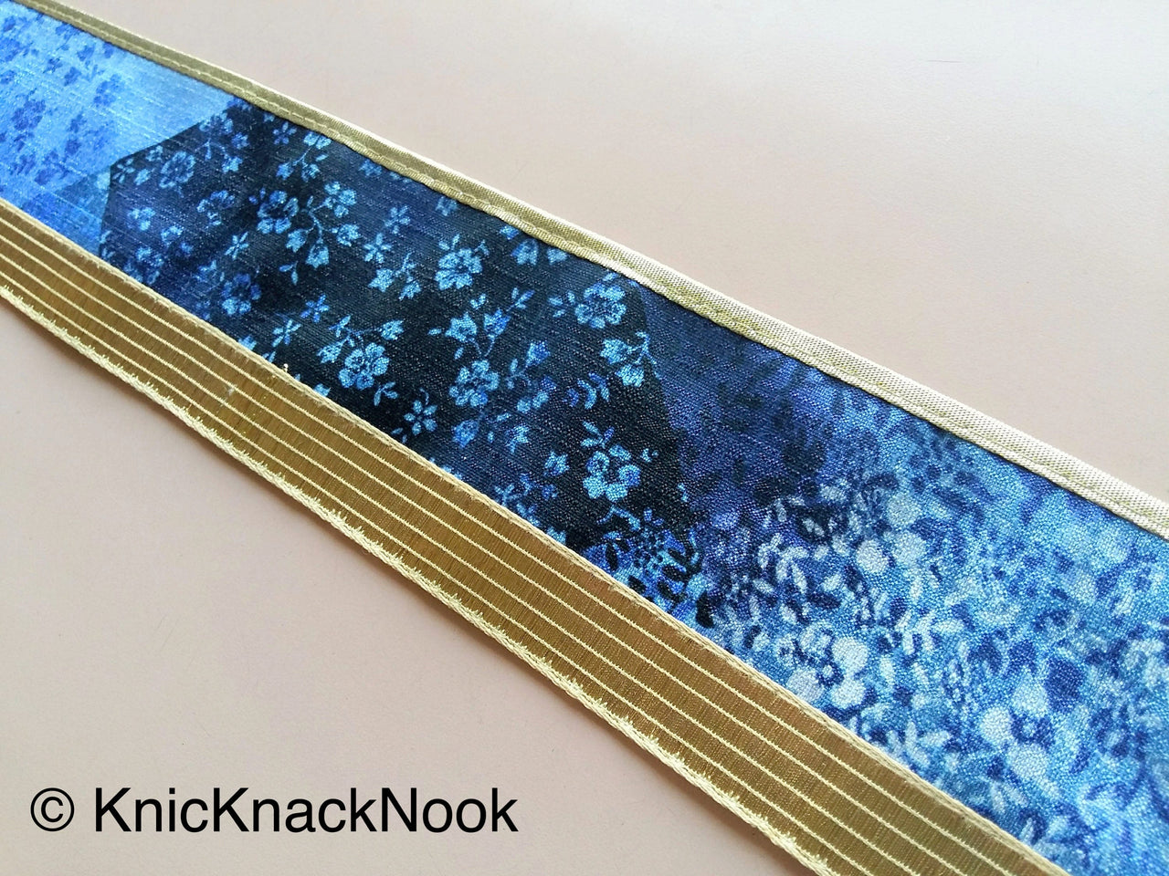 Blue And Gold Fabric Trim With Floral Design, Digital Print Trim Border - 200317L407