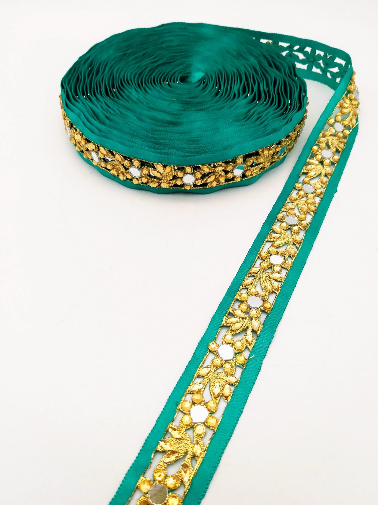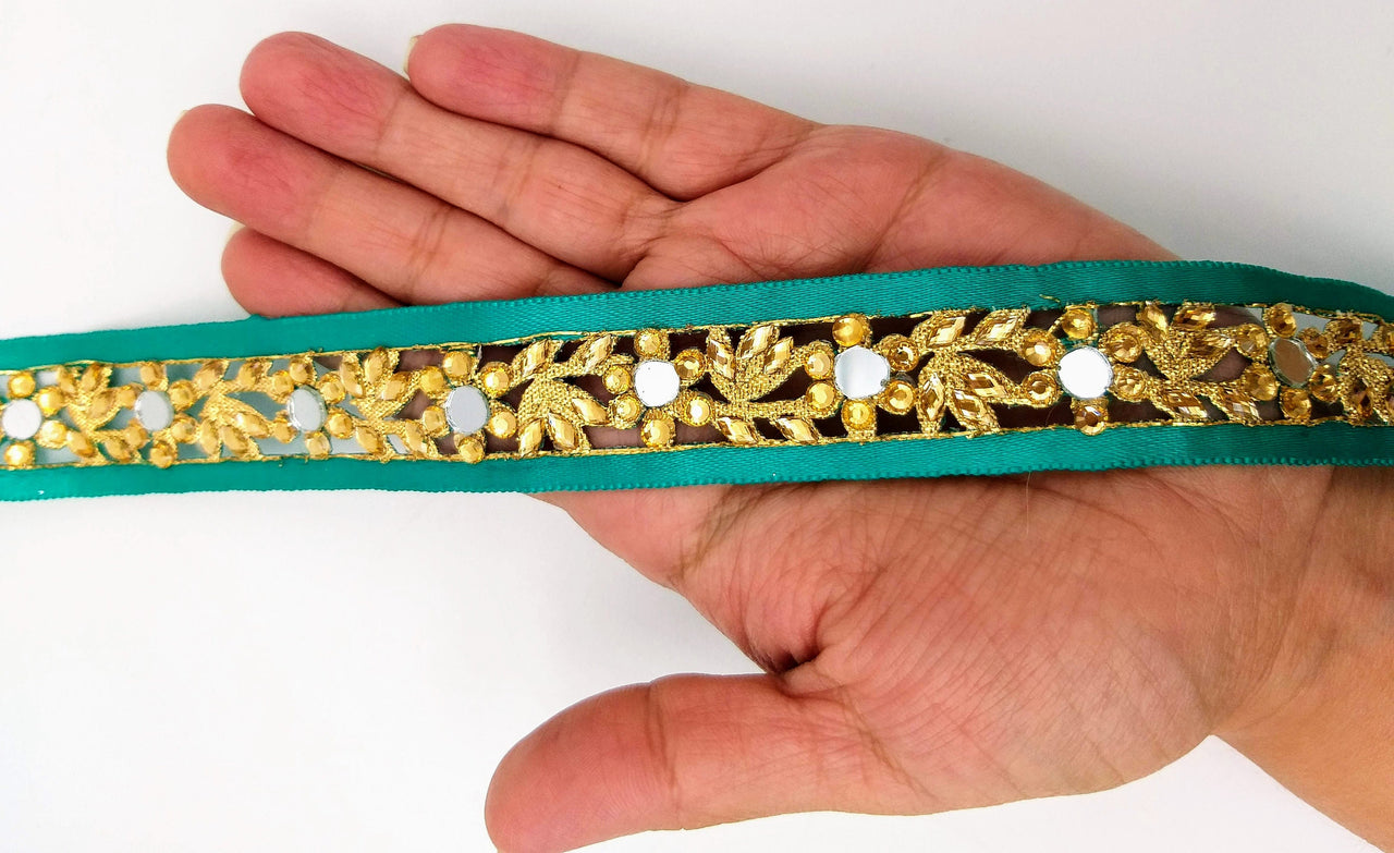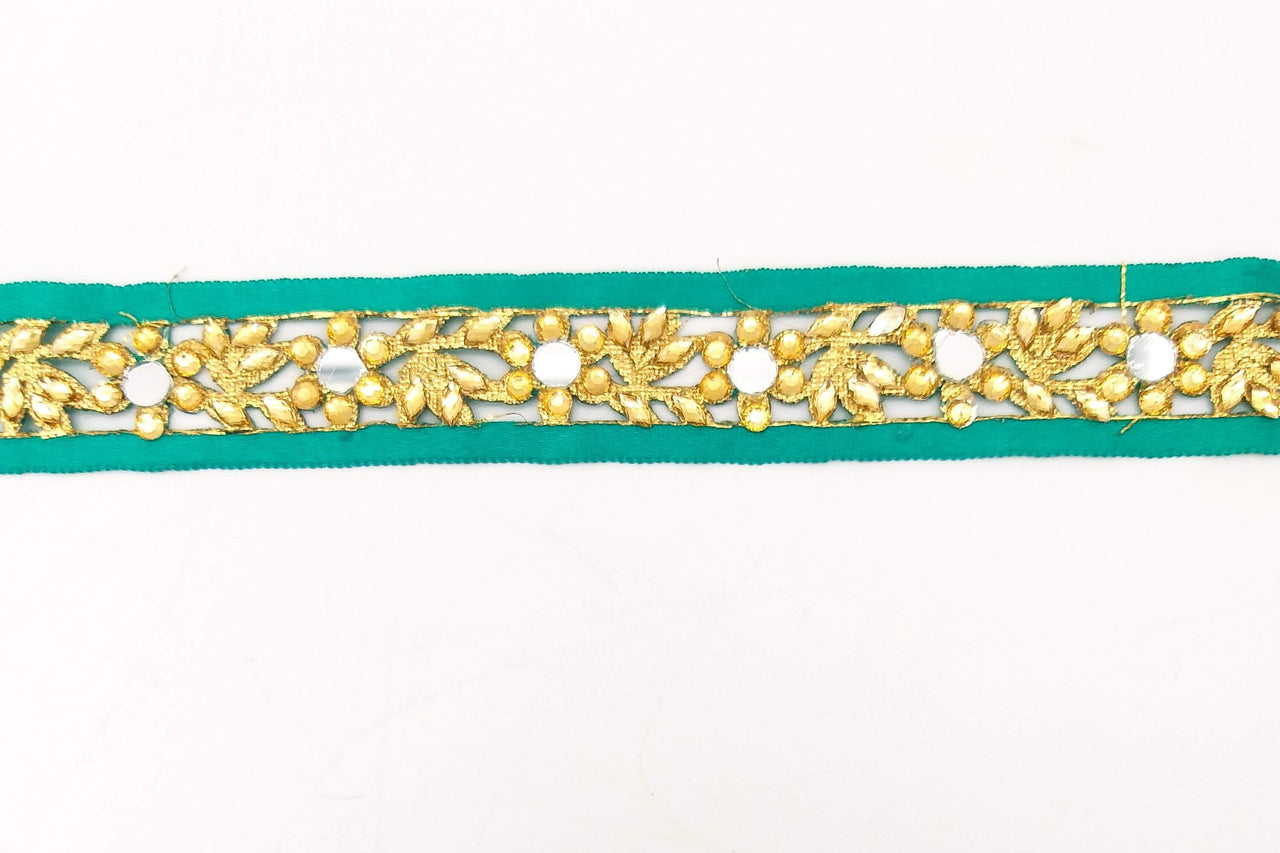 Dark Green Satin Ribbon Floral Cutwork Lace Trim Embellished with Real Mirrors and Kundan Beads, Decorative Trim, Trim By 3 Yards