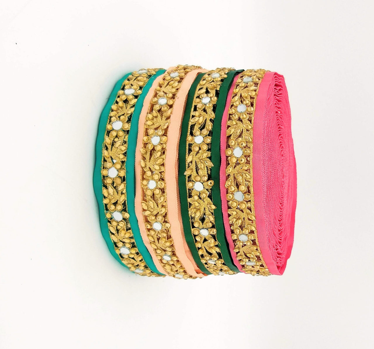 The embroidery on this trim is called Zardozi, an exclusive type of embroidery that is done by hand. Zardozi comes from two Persian words: zar or zarin meaning 'gold', and dozi meaning 'sewing'. Zardozi is a type of heavy and elaborate metal embroidery on a silk, satin, or velvet fabric base.