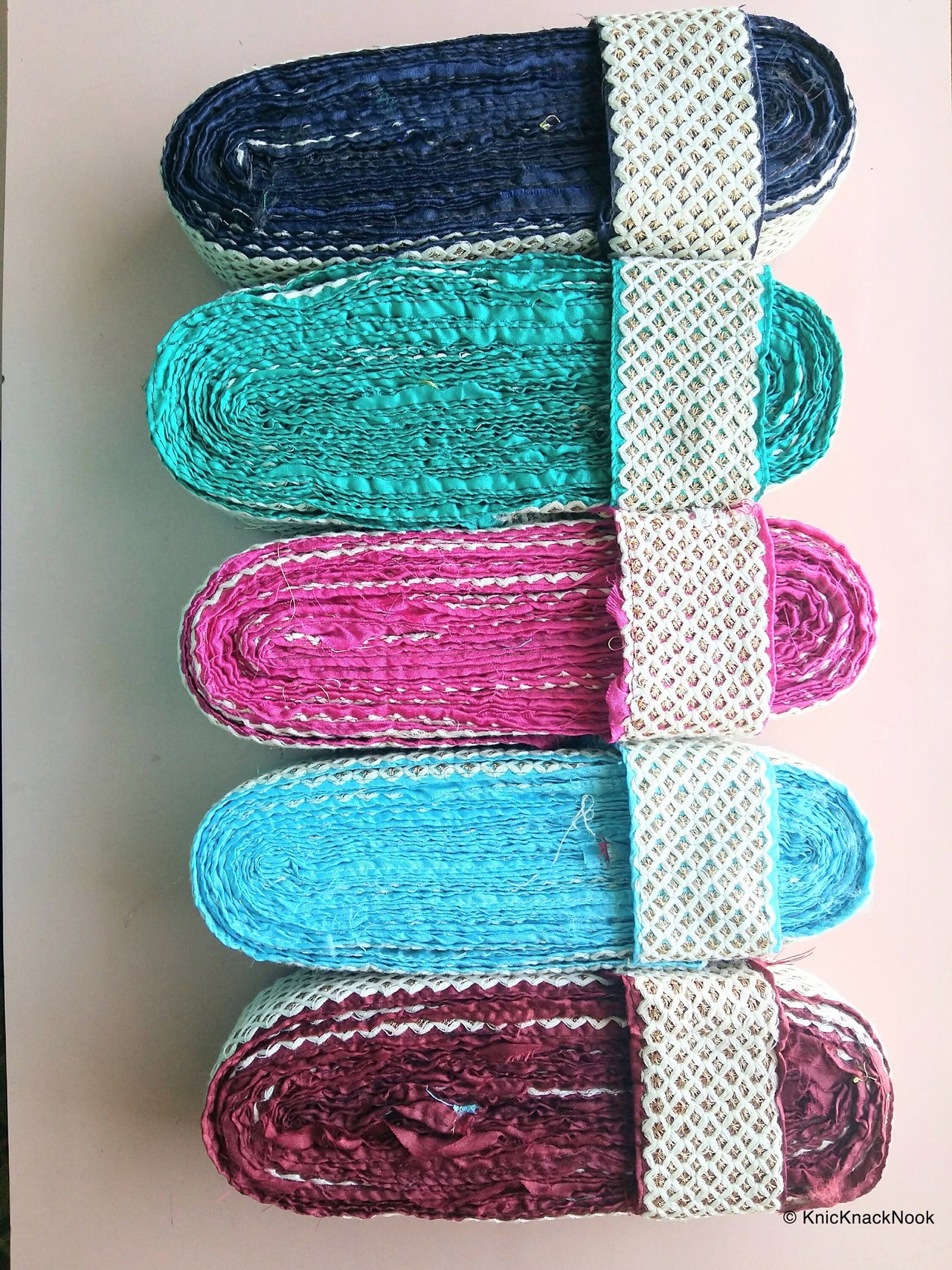 Fuchsia / Blue / Dark Blue / Maroon / Green Fabric Trim With Off White And Gold Embroidery, 55mm wide - 200317L512/13/14/15/16