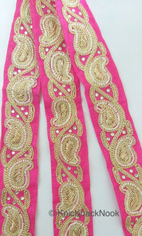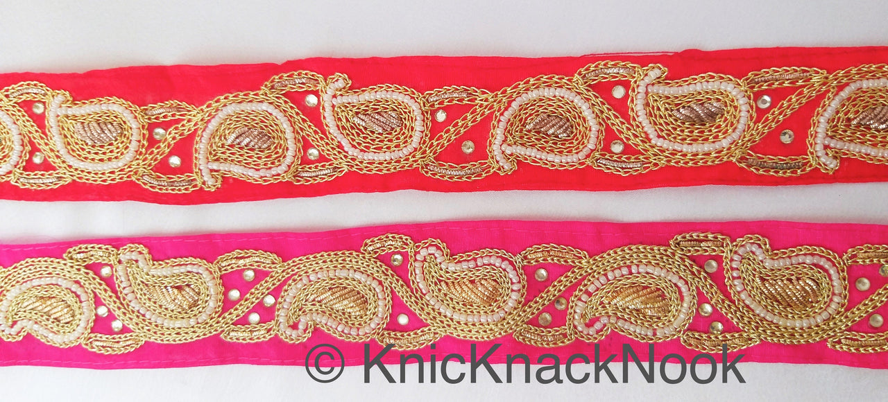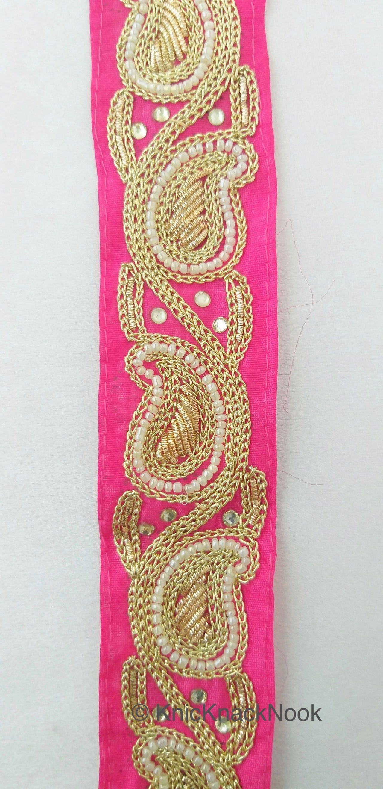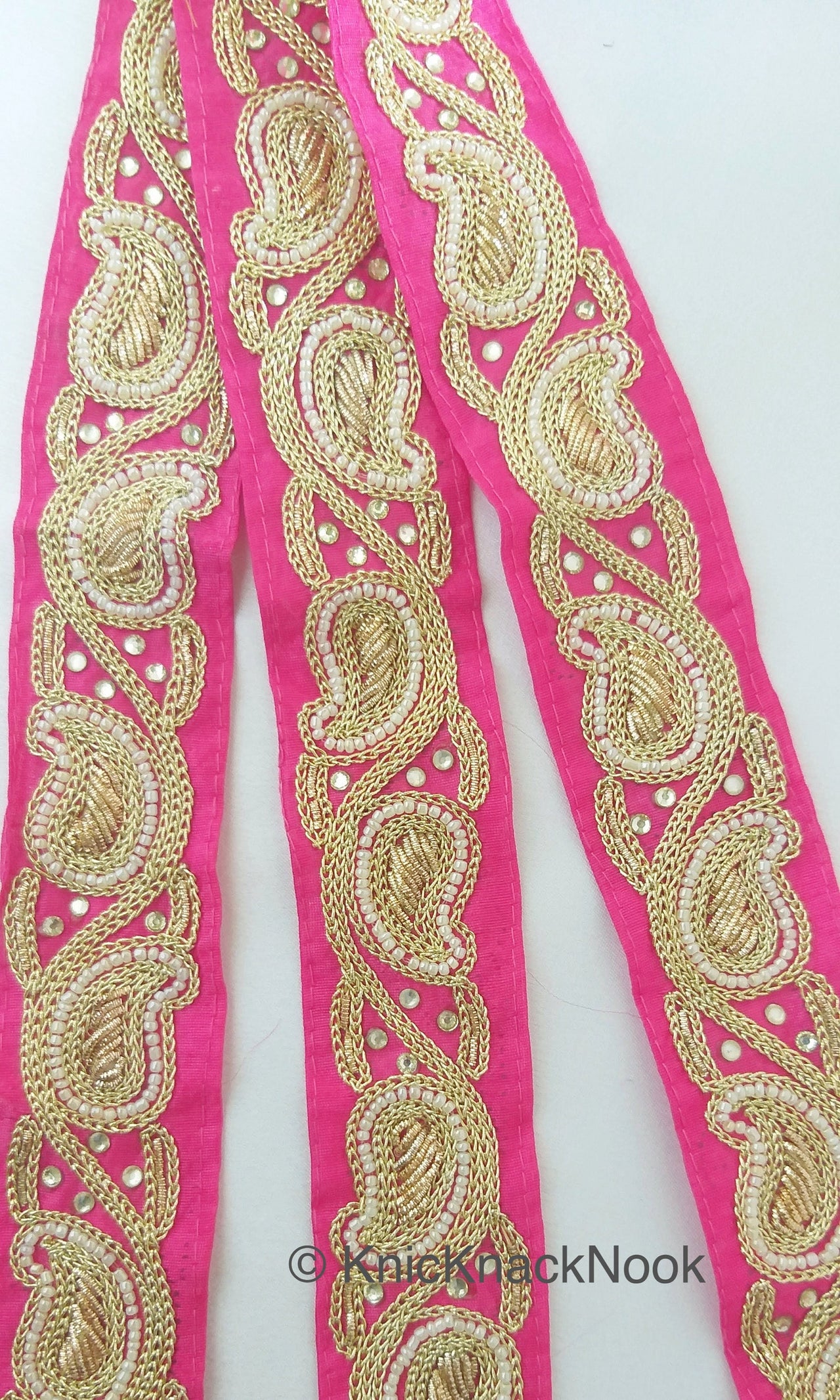 Pink Lace Trim With Floral Zardozi Hand Embroidery And White Beads & Indian Stones Kundan Embellishment, Approx. 40mm, Decorative Trim