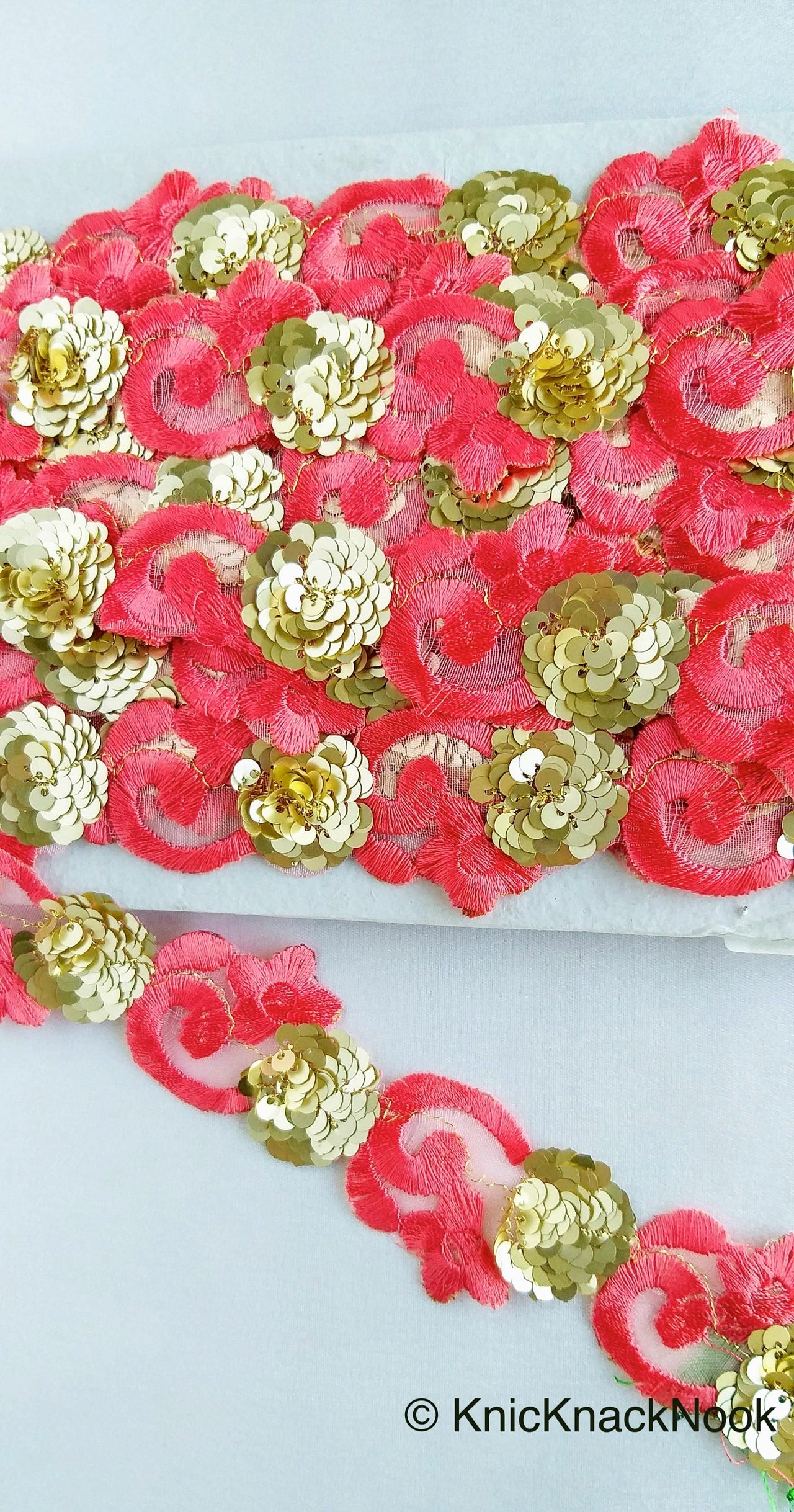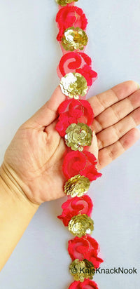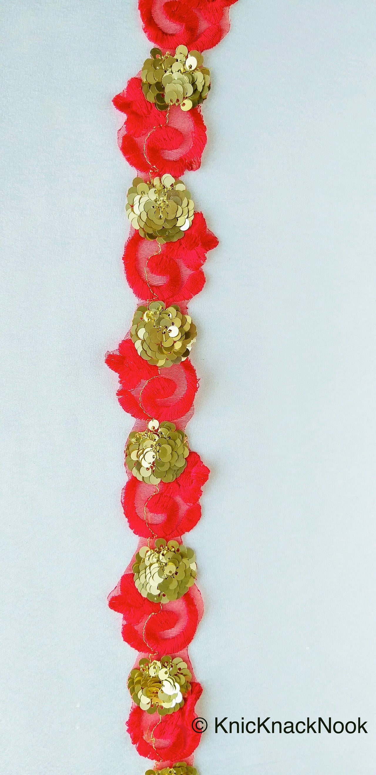 Red Lace Trim, Tissue Fabric Cutwork With Floral Embroidery & Gold Sequins,