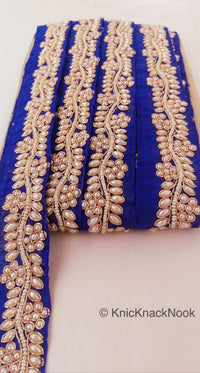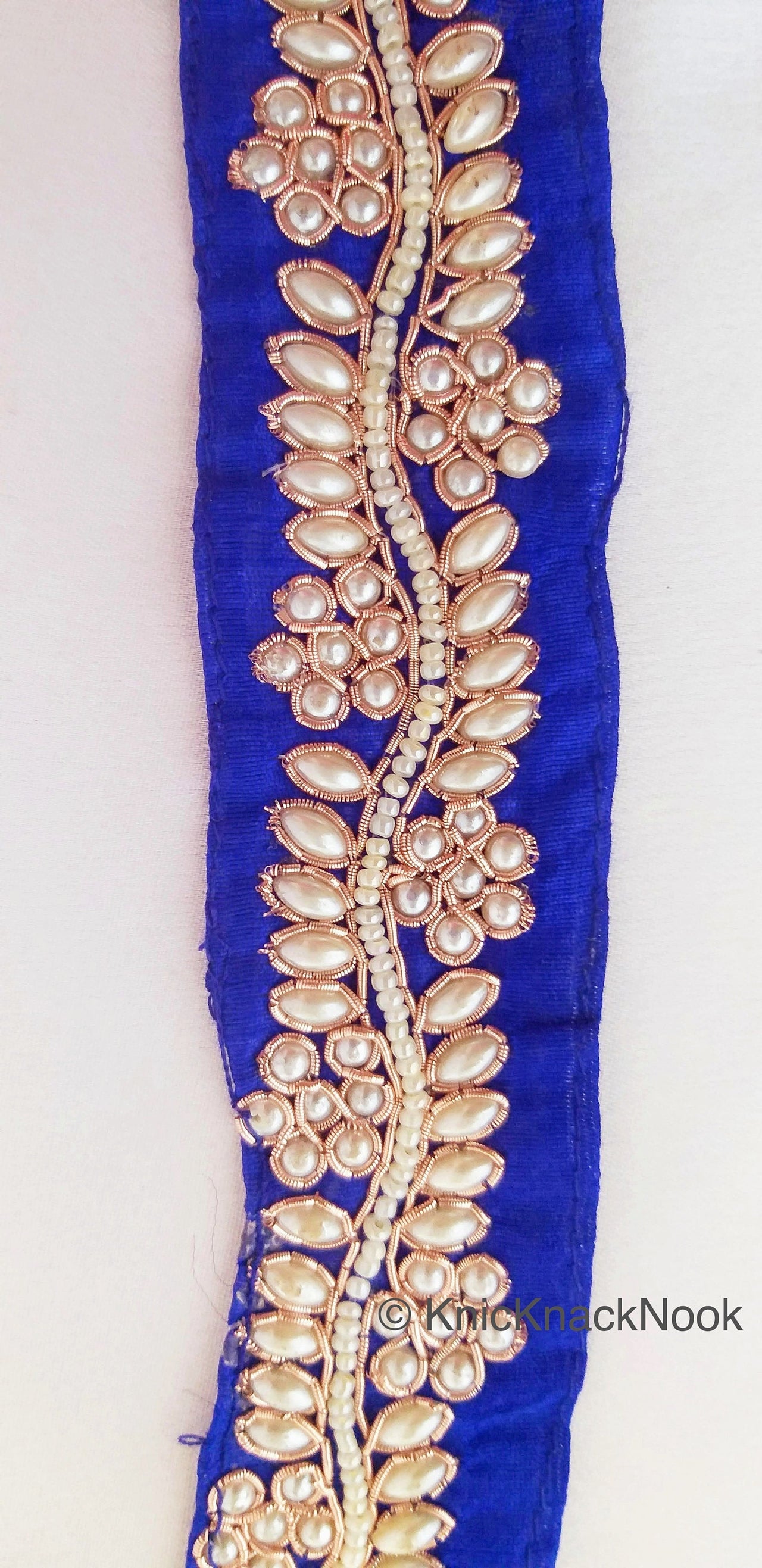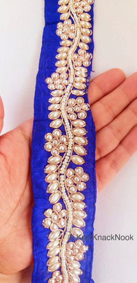 Royal Blue Silk Lace Trim With Floral Hand Embroidery And White Beads, Approx. 38mm, Decorative Trim Costume Trim Indian Border