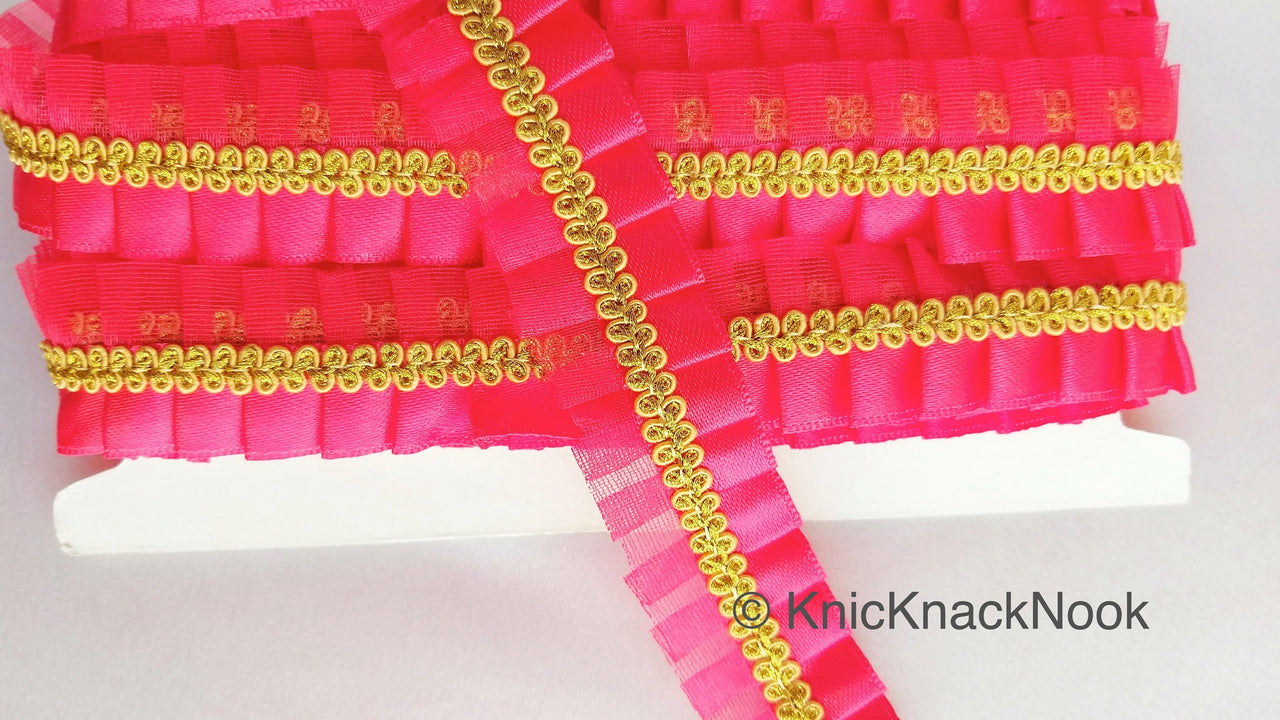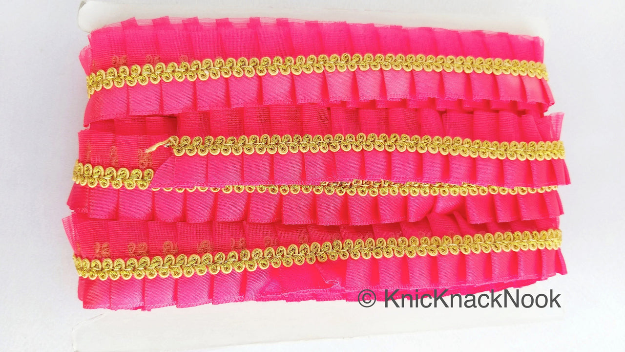 Watermelon Red Satin And Watermelon Red Net Fabric Trim With Gold Embroidery Trimming, Pleated Lace, Trim