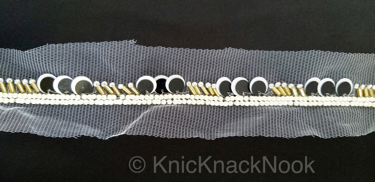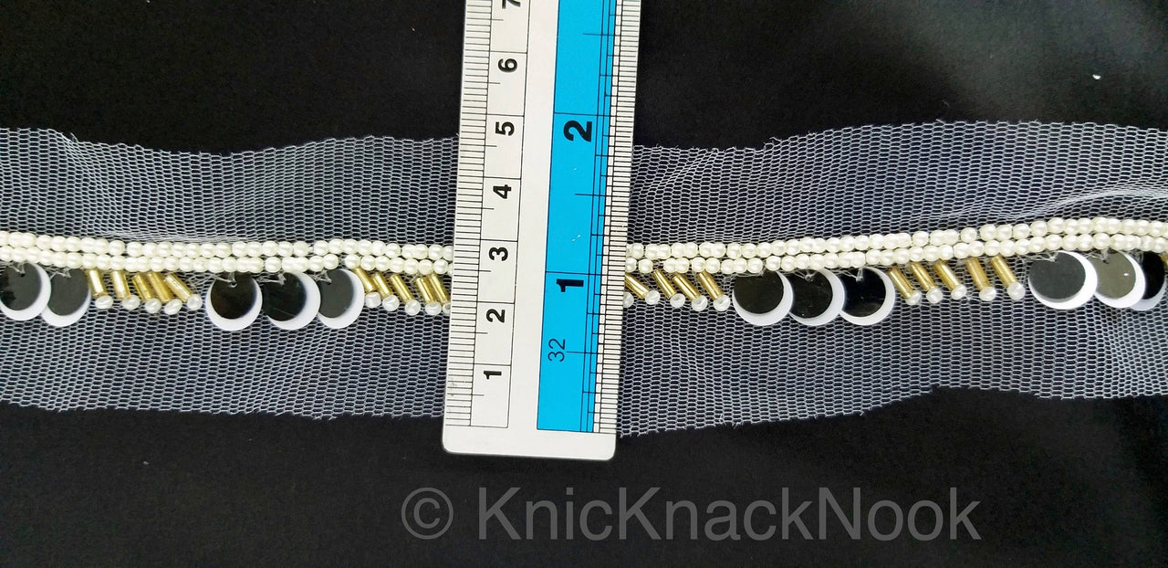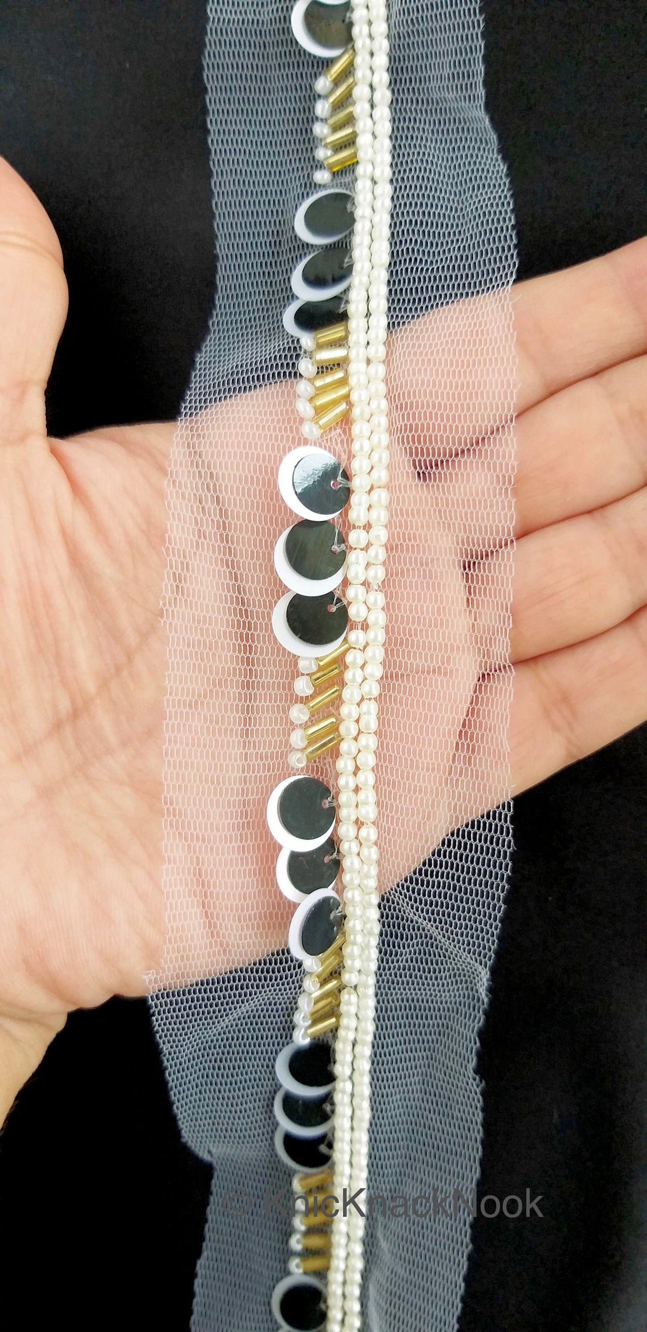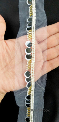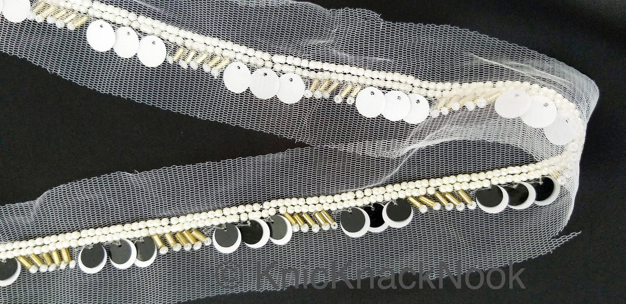 White Net Lace With Black & White Sequins and Beads, Exclusive Laces, Sequinned Trimming