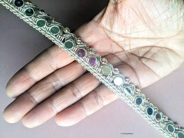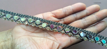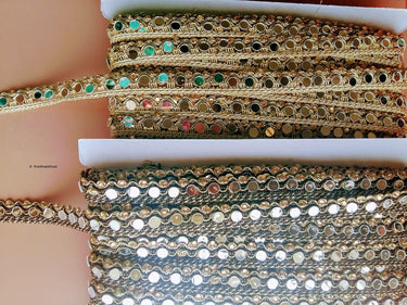 This listing is for a lovely Beige / Black And Gold Trim With Mirrors And Diamante Embellishments. The embroidery work with mirrors on this trim is a speciality of Indian workmanship. This is a very unique fabric trim and a special KnicKnackNook find which you will not find anywhere else.