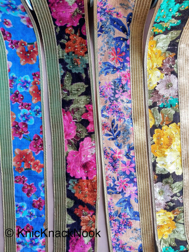 This listing is for a lovely Beautiful Brown And Gold Fabric Trim With Yellow, Green And Brown Floral Design Embellished With Diamantes, Digital Print Trim Border.