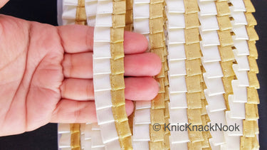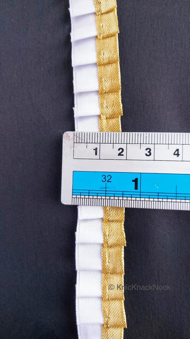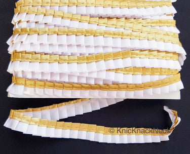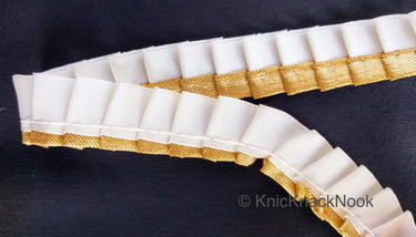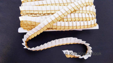 This listing is for a lovely Satin, White & Gold Pleated Lace Trim, Saree Border Trim.