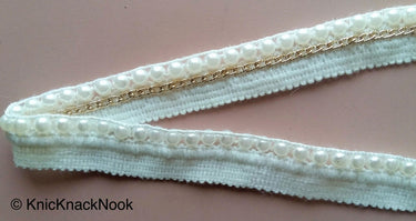 This listing is for a lovely White Pearl Embellishments On White Cotton And Gold Threaded Trim, Dyeable Trim.