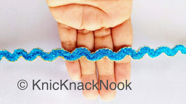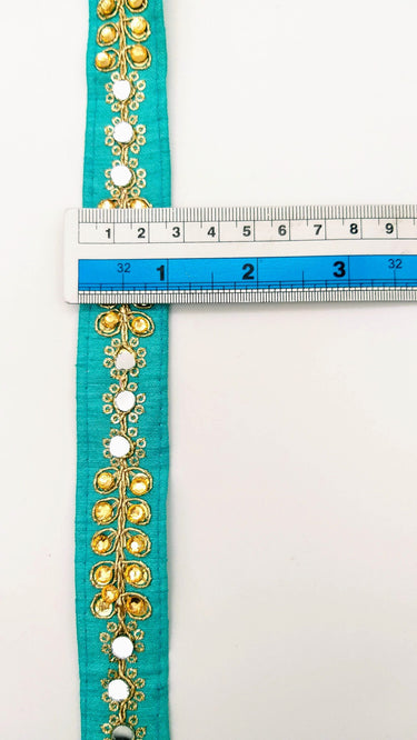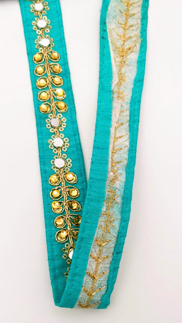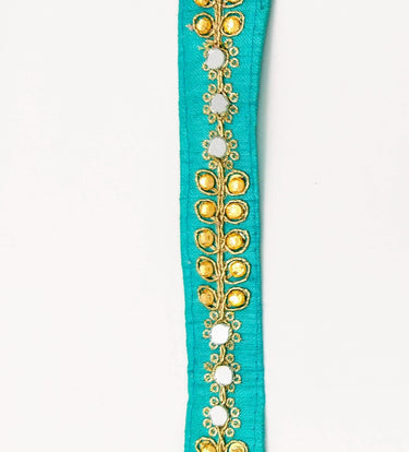 This listing is for a lovely Cyan Blue Art Silk Trim With Kundan Stones, Beads And Mirrors Embellishments, Approx. 22mm, Decorative Trim, Trim By 3 Yards.