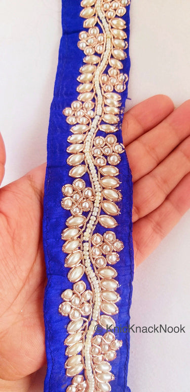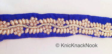 This listing is for a lovely Royal Blue Silk Lace Trim With Floral Hand Embroidery And White Beads, Approx. 38mm, Decorative Trim Costume Trim Indian Border, Beaded Trim.