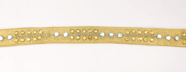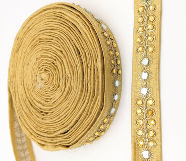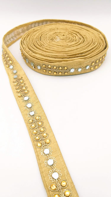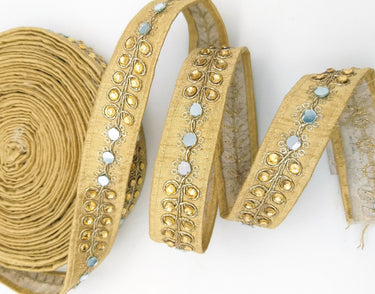 This listing is for a lovely Beige Art Silk Trim With Kundan Stones, Beads And Mirrors Embellishments, Approx. 22mm, Decorative Trim, Trim By 3 Yards.