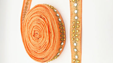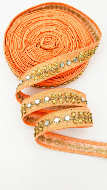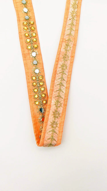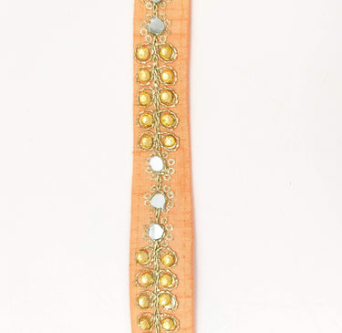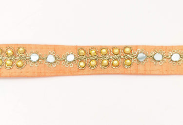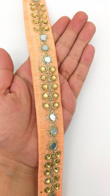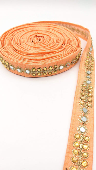 This listing is for a lovely Peach Art Silk Trim With Kundan Stones, Beads And Mirrors Embellishments, Approx. 22mm, Decorative Trim, Trim By 3 Yards.