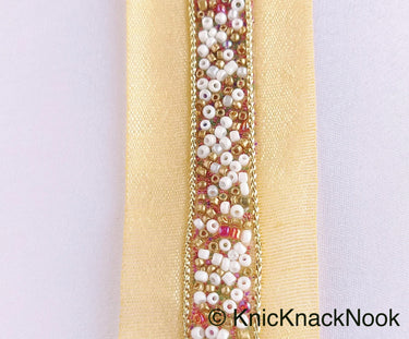 This listing is for a lovely Cerise Pink Fabric Embroidered Trim with Gold Beads, Decorative Sari Trim, Trim By 3 Yards, Beaded Trim.