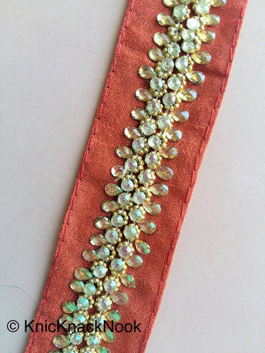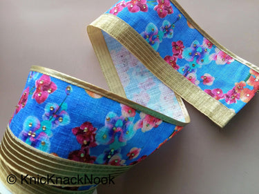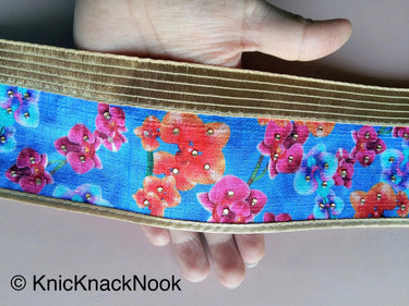 This listing is for a lovely Beautiful Blue And Gold Fabric Trim With Pink, Orange And Blue Floral Design Embellished With Diamantes, Digital Print Trim Border.