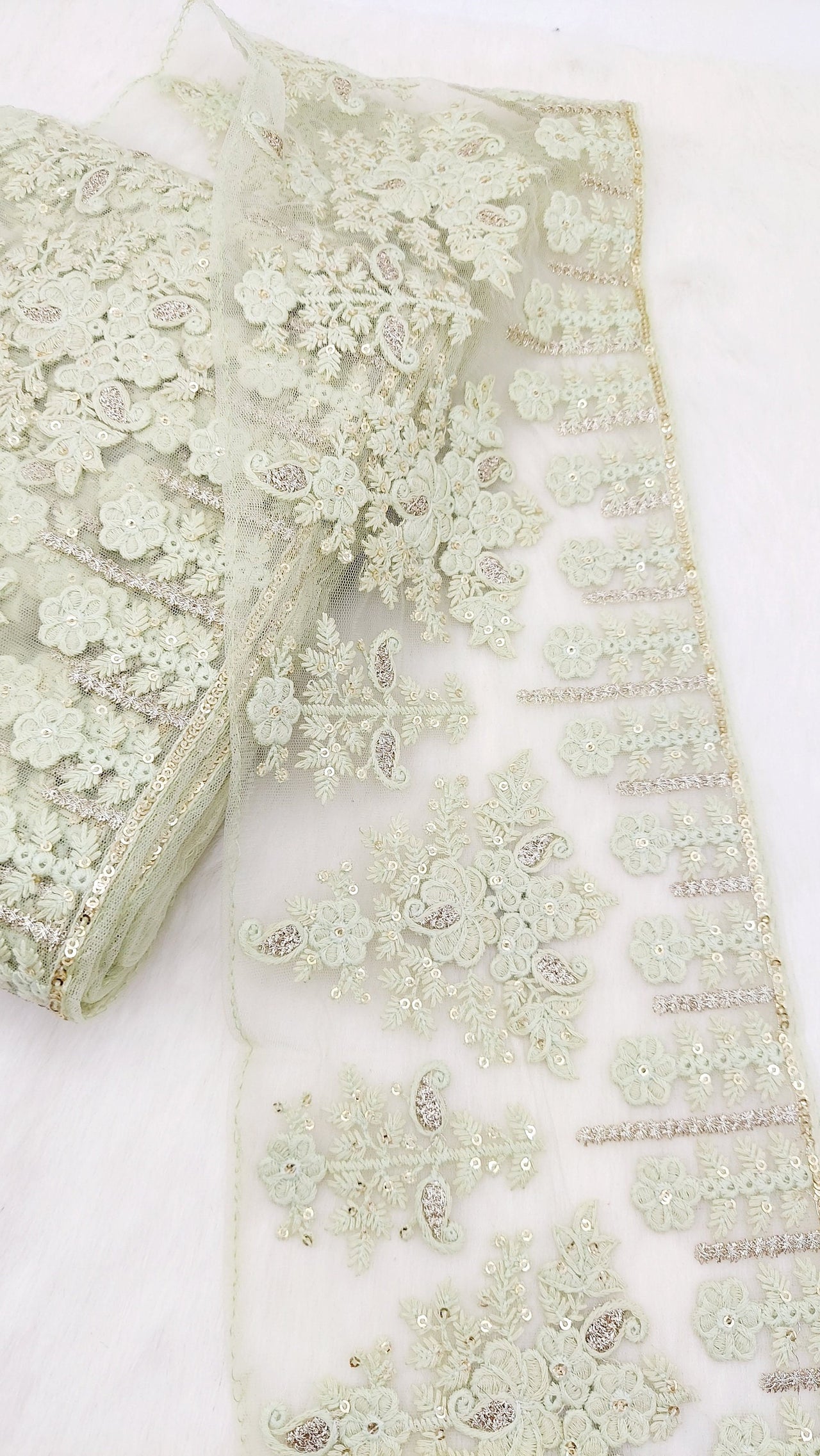 9 Yards Green Net Lace Trim Floral Embroidery and Gold Sequins, Floral Sari Border, Decorative Trim