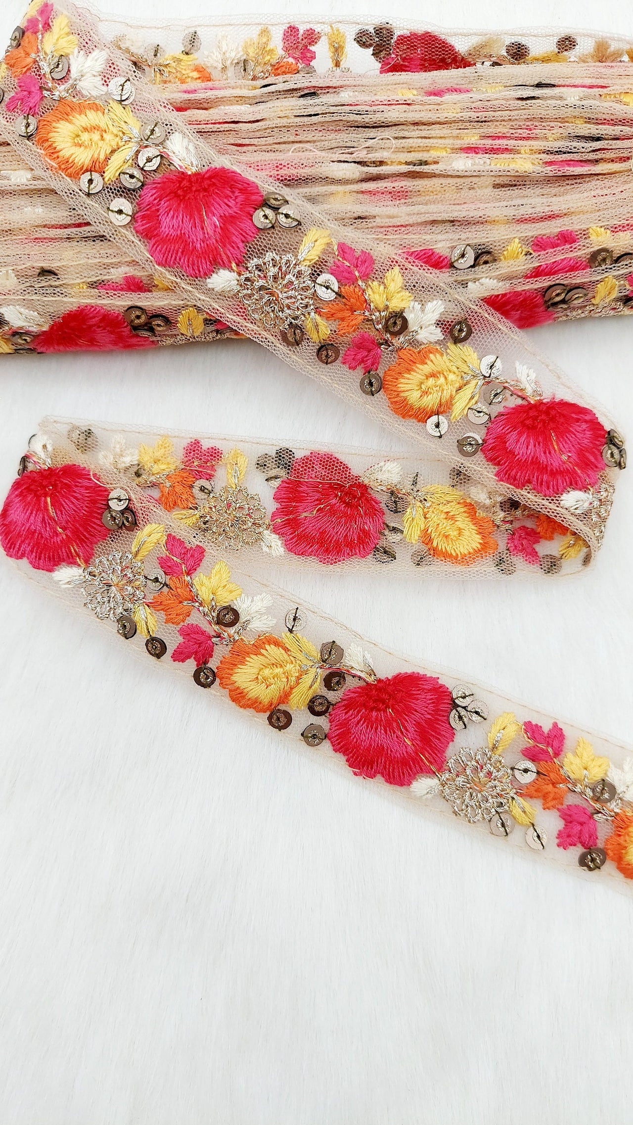 This listing is for 9 Yards Pink and Yellow Soft Net Lace Trim Floral Embroidery and Gold Sequins, Floral Sari Border, Decorative Trim.