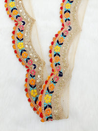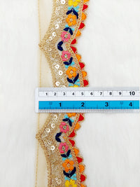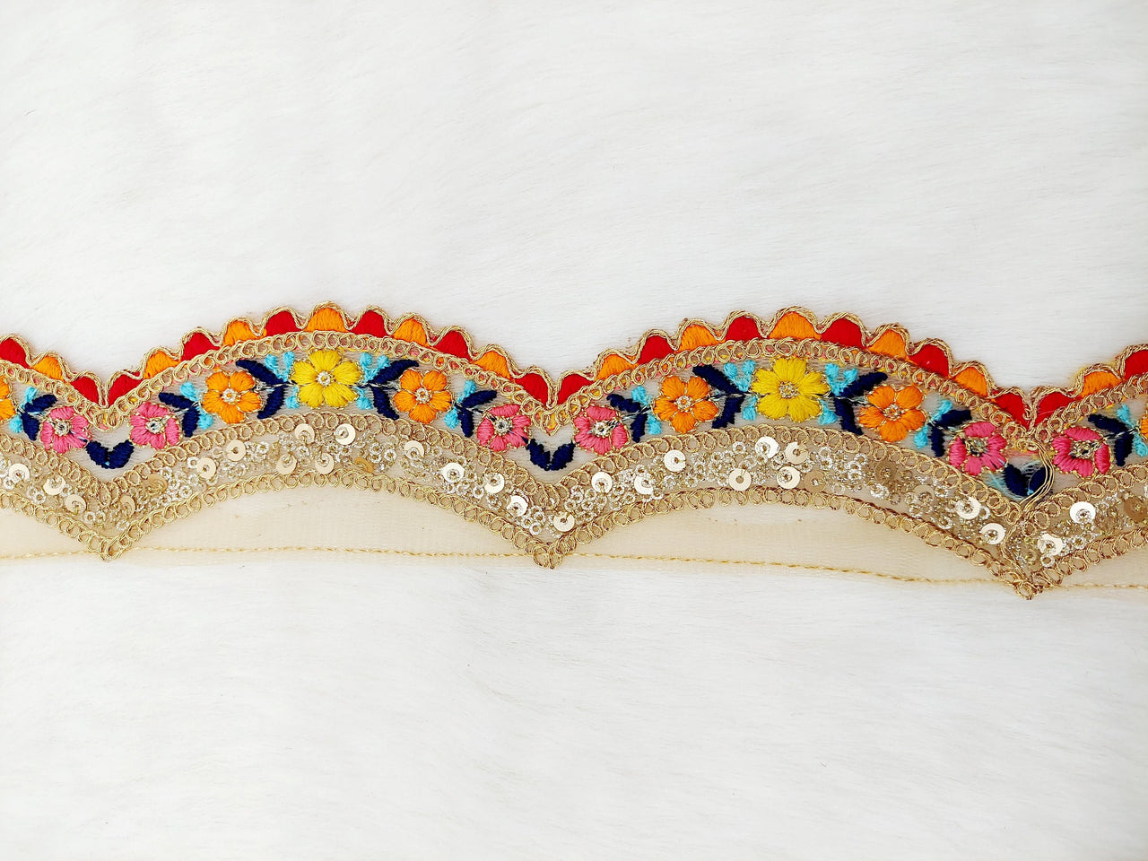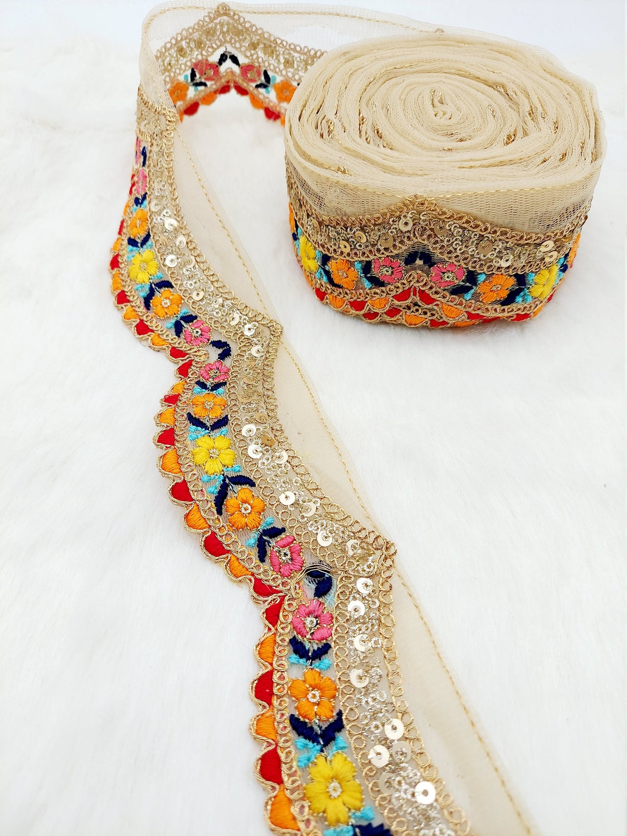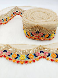 9 Yards Scallop Sequin Floral Border, Beige Shimmer Tissue Fabric Lace Trim Flowers Embroidery, Floral Sari Trimming