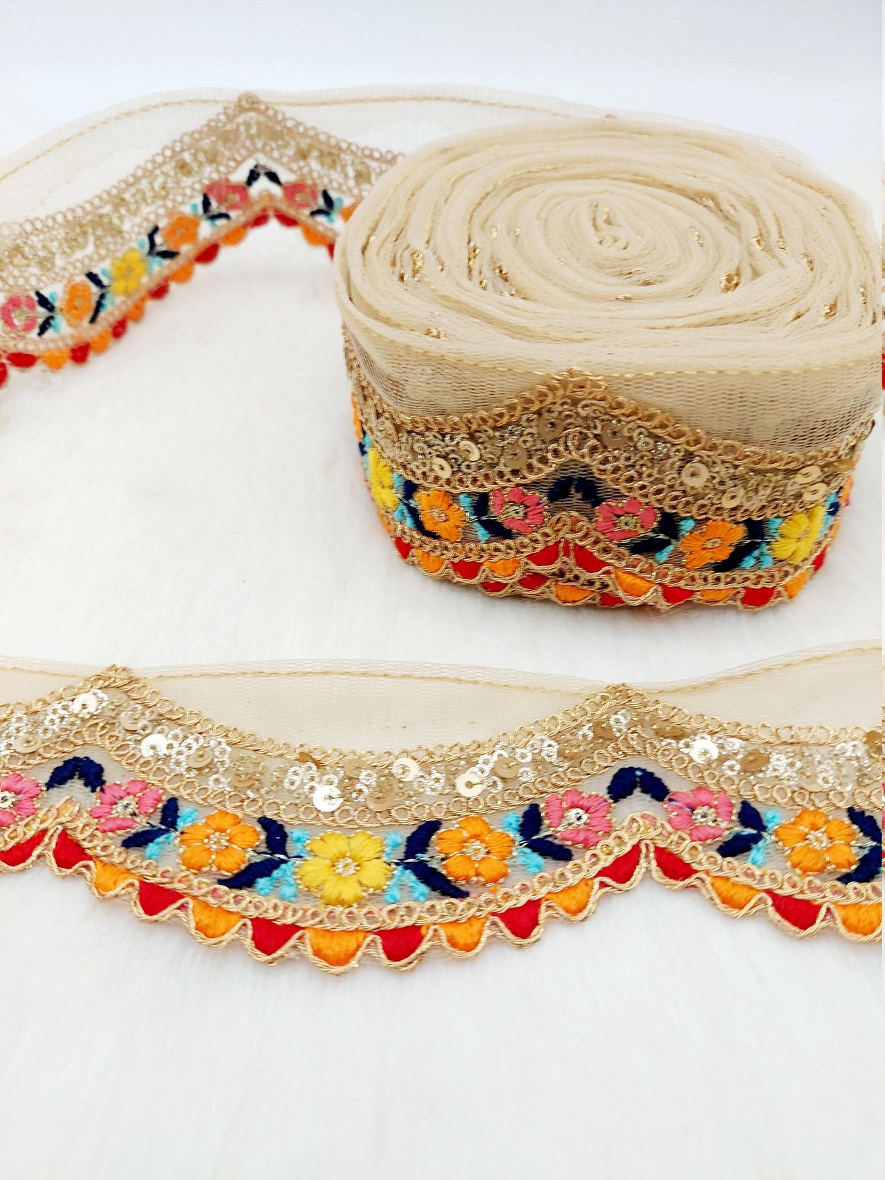 This listing is for a lovely Floral Embroidered Cutwork Trim, Yellow Embroidery, Beaded Floral Trim, Approx. 40mm Wide, Decorative Trim, Crafting Ribbon. This is a very unique fabric trim and a special KnicKnackNook find which you will not find anywhere else.