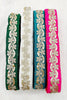 The embroidery on this trim is called Zardozi, an exclusive type of embroidery that is done by hand. Zardozi comes from two Persian words: zar or zarin meaning 'gold', and dozi meaning 'sewing'. Zardozi is a type of heavy and elaborate metal embroidery on a silk, satin, or velvet fabric base.