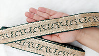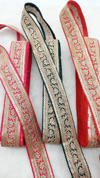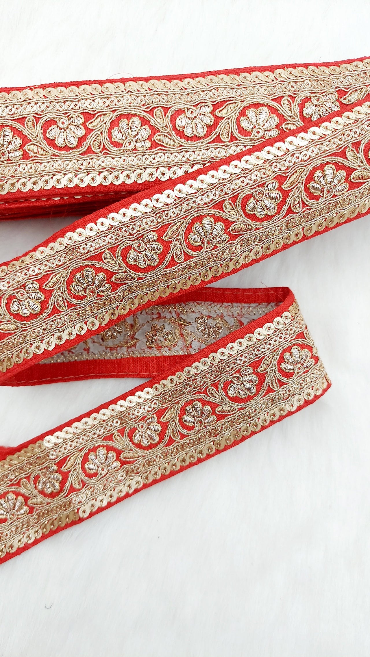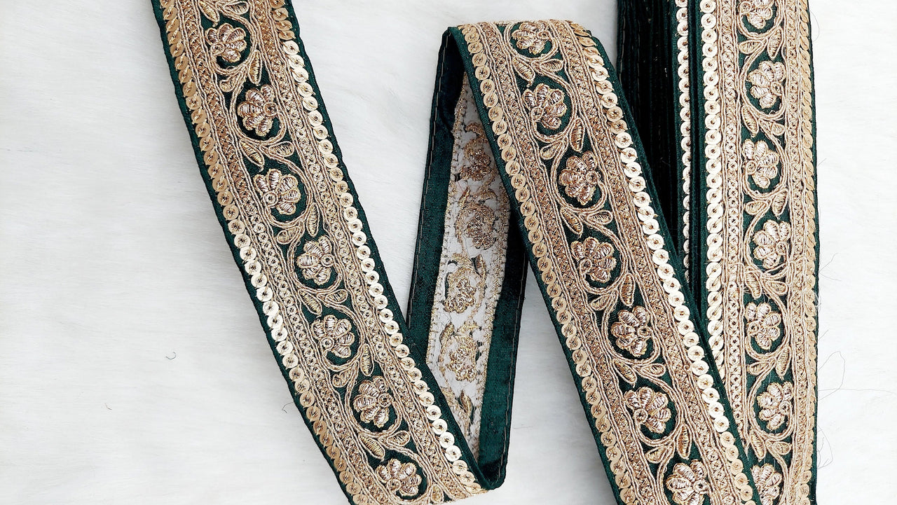 The embroidery on this trim is called Zardozi, an exclusive type of embroidery that is done by hand. Zardozi comes from two Persian words: zar or zarin meaning 'gold', and dozi meaning 'sewing'. Zardozi is a type of heavy and elaborate metal embroidery on a silk, satin, or velvet fabric base.