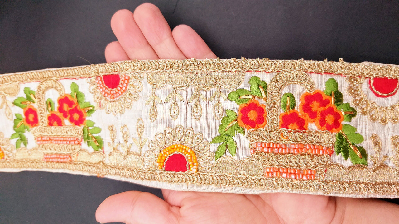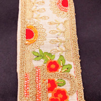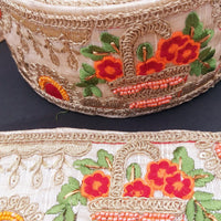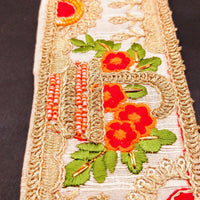 Beige Art Silk Fabric Trim With Green, Orange, Red And Gold Floral Embroidery