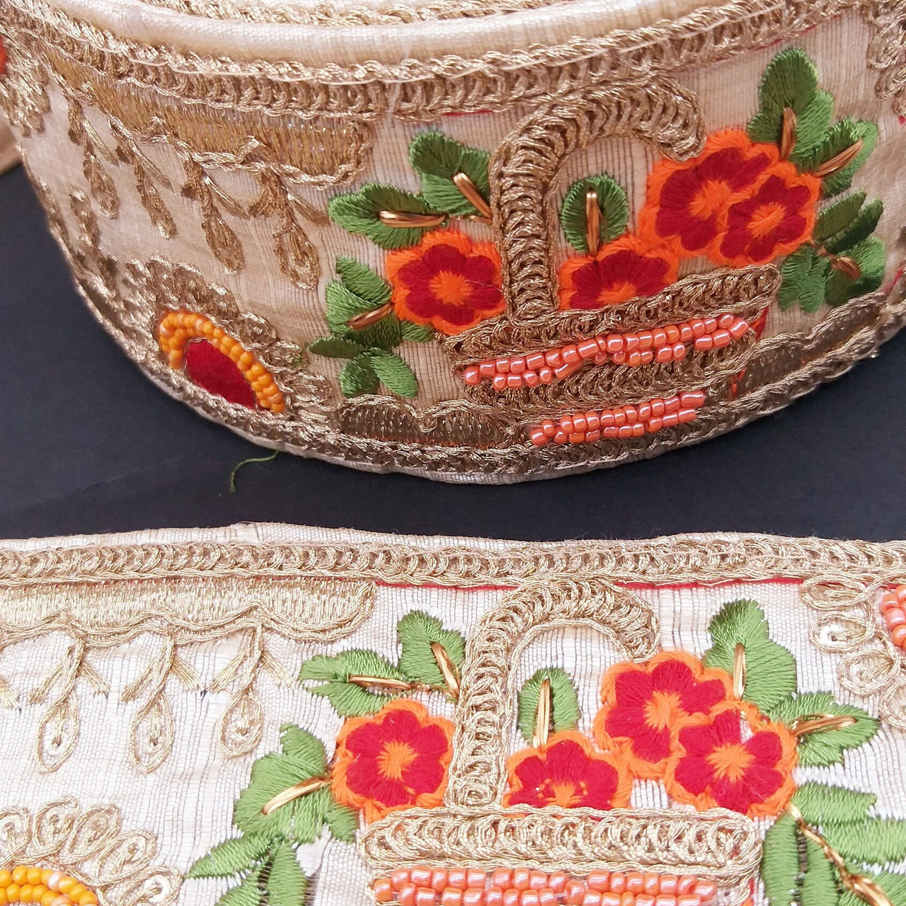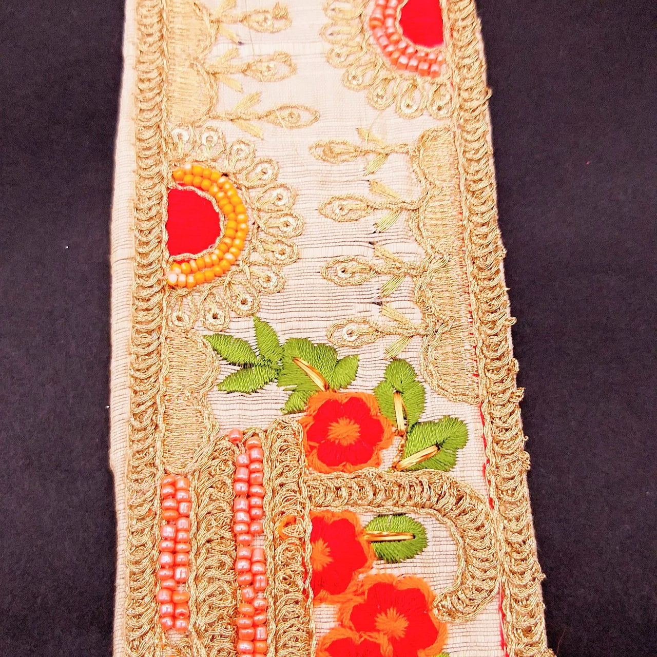 The embroidery on this trim is called Zardozi, an exclusive type of embroidery that is done by hand. Zardozi comes from two Persian words: zar or zarin meaning 'gold', and dozi meaning 'sewing'. Zardozi is a type of heavy and elaborate metal embroidery on a silk, satin, or velvet fabric base.