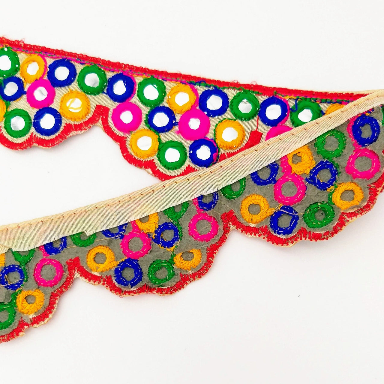 Beige Multicoloured Indian Mirror Trim, Kutch Embroidered Navratri Garba Dress Trim Bridal Lace, Indian Sari Border 42 mm Wide Trim Per Yard