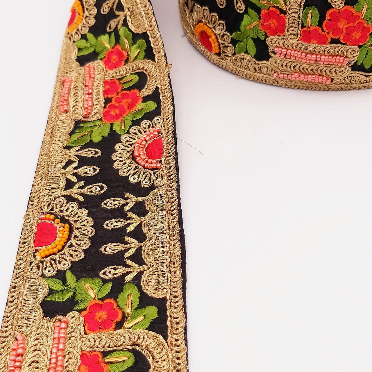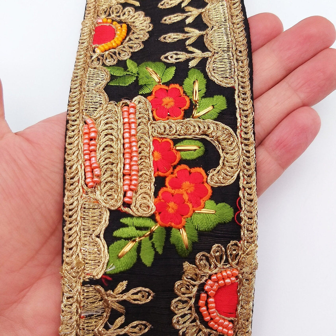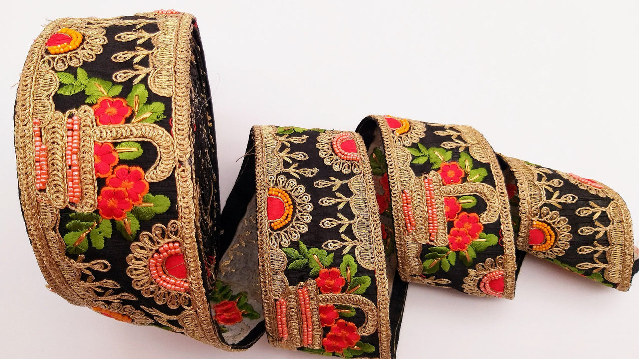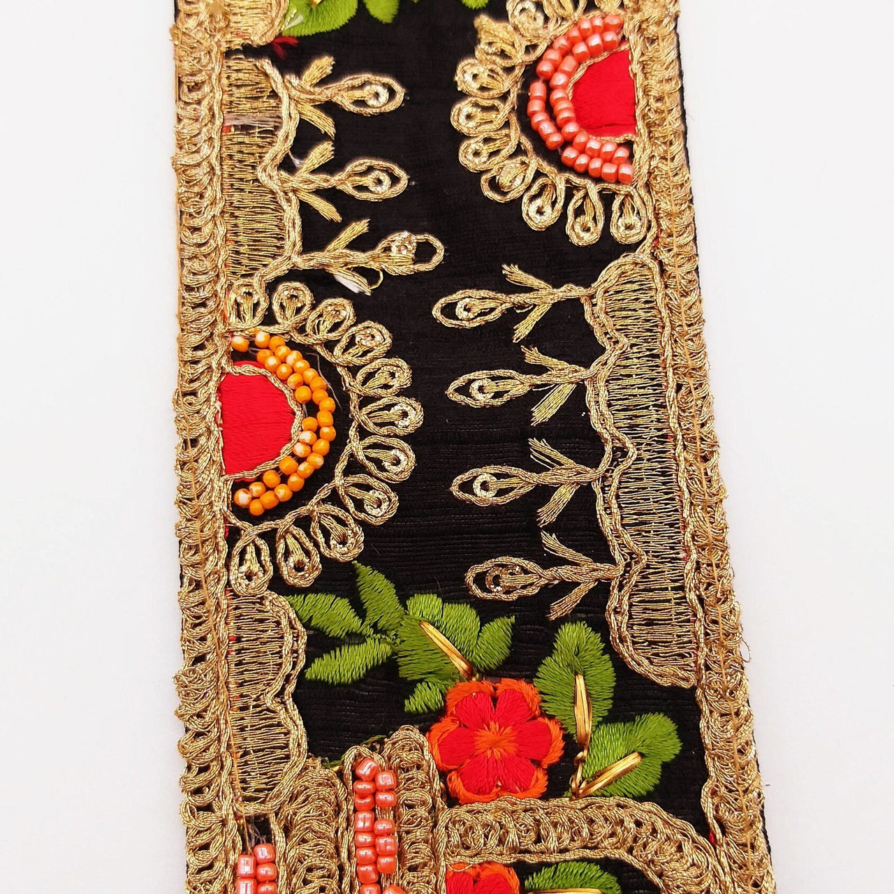 Black Art Silk Fabric Trim With Green, Orange, Red And Gold Floral Embroidery