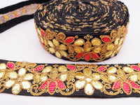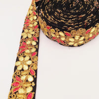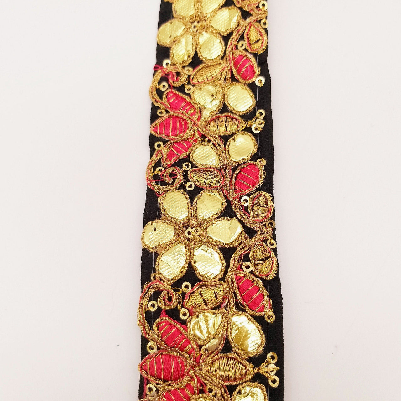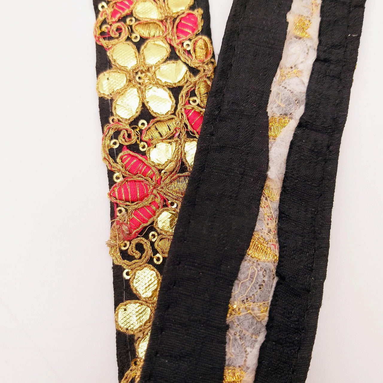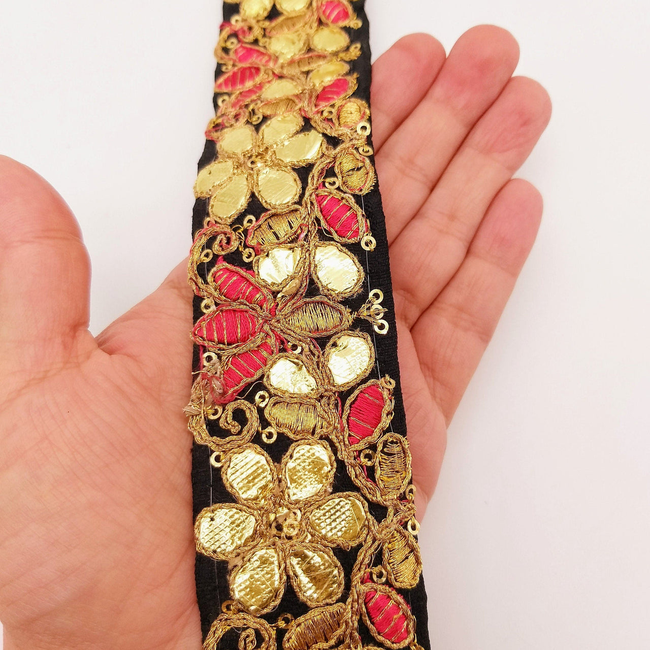 Black Fabric Trim In Pink & Gold Floral Embroidery, Gota Patti Trim, Indian Flower Border