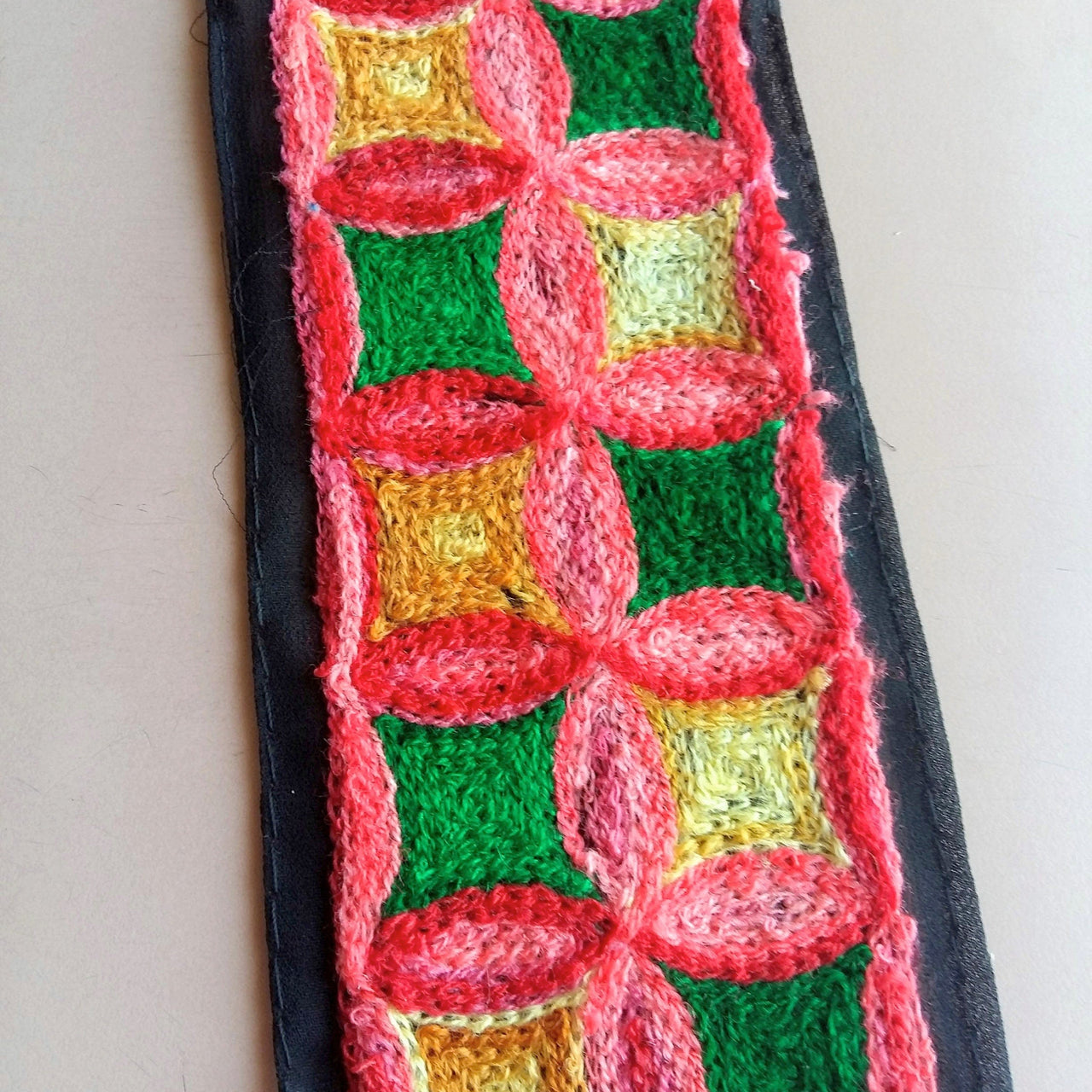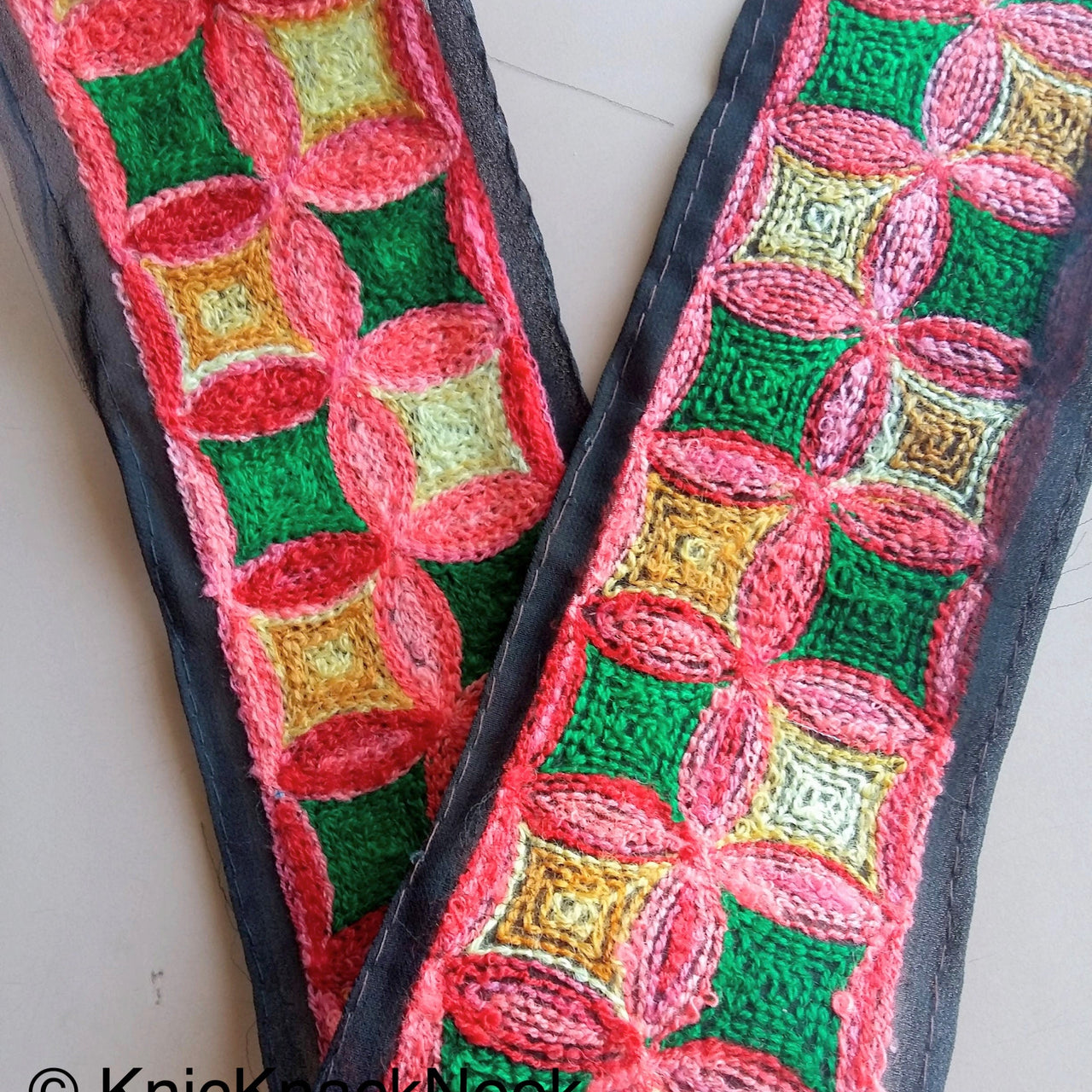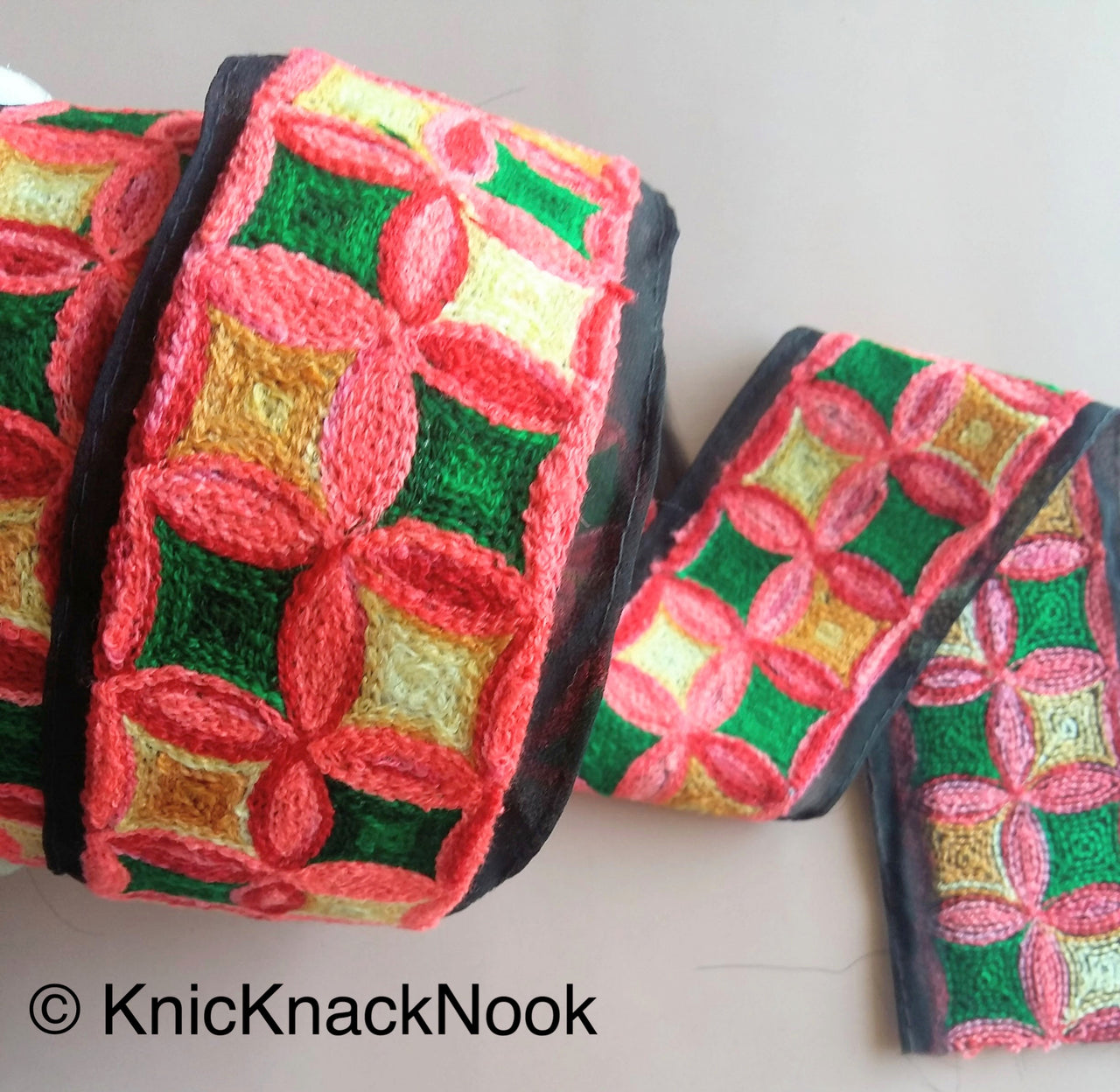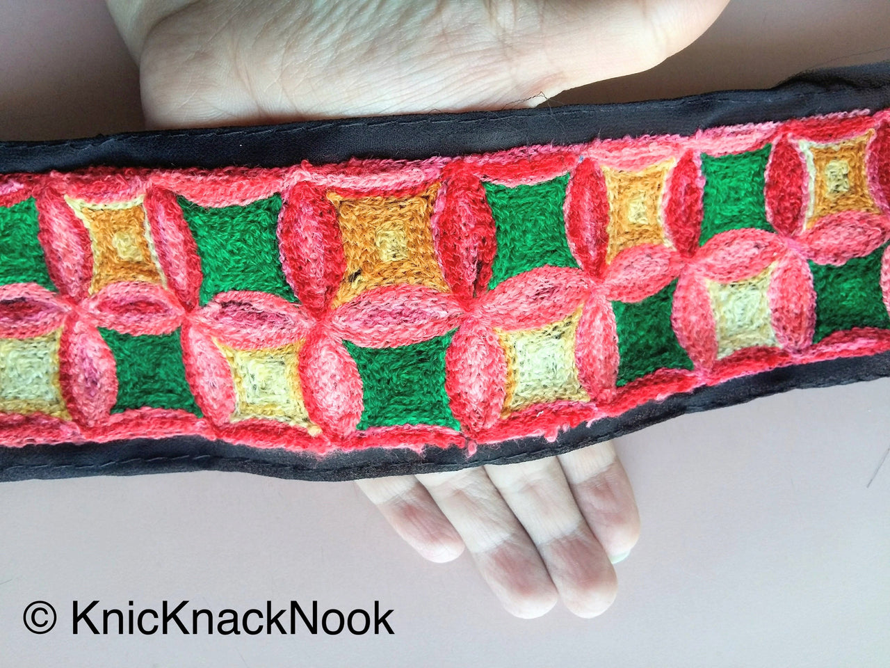 Black Fabric Trim With Green, Pink, Red And Yellow Square And Circle Pattern Thread Embroidery Trim