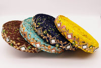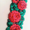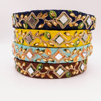 The embroidery on this trim is called Zardozi, an exclusive type of embroidery that is done by hand. Zardozi comes from two Persian words: zar or zarin meaning 'gold', and dozi meaning 'sewing'. Zardozi is a type of heavy and elaborate metal embroidery on a silk, satin, or velvet fabric base.