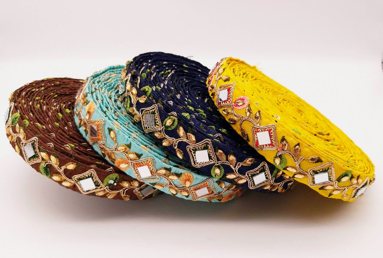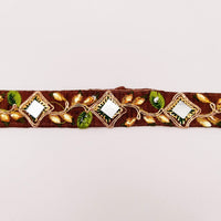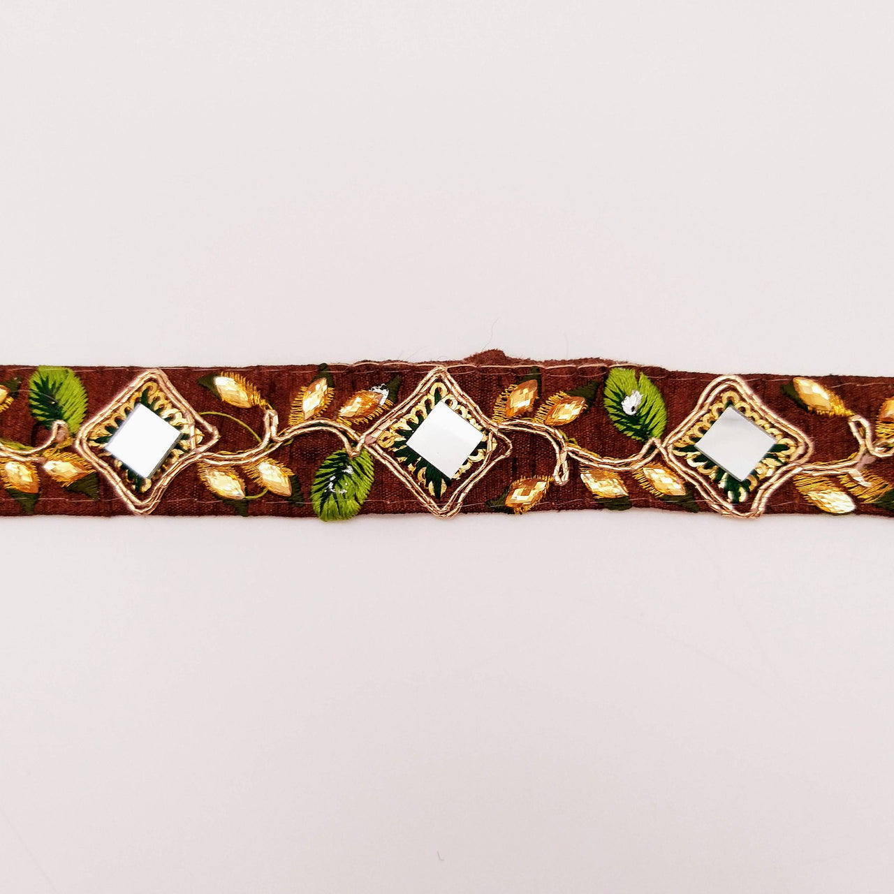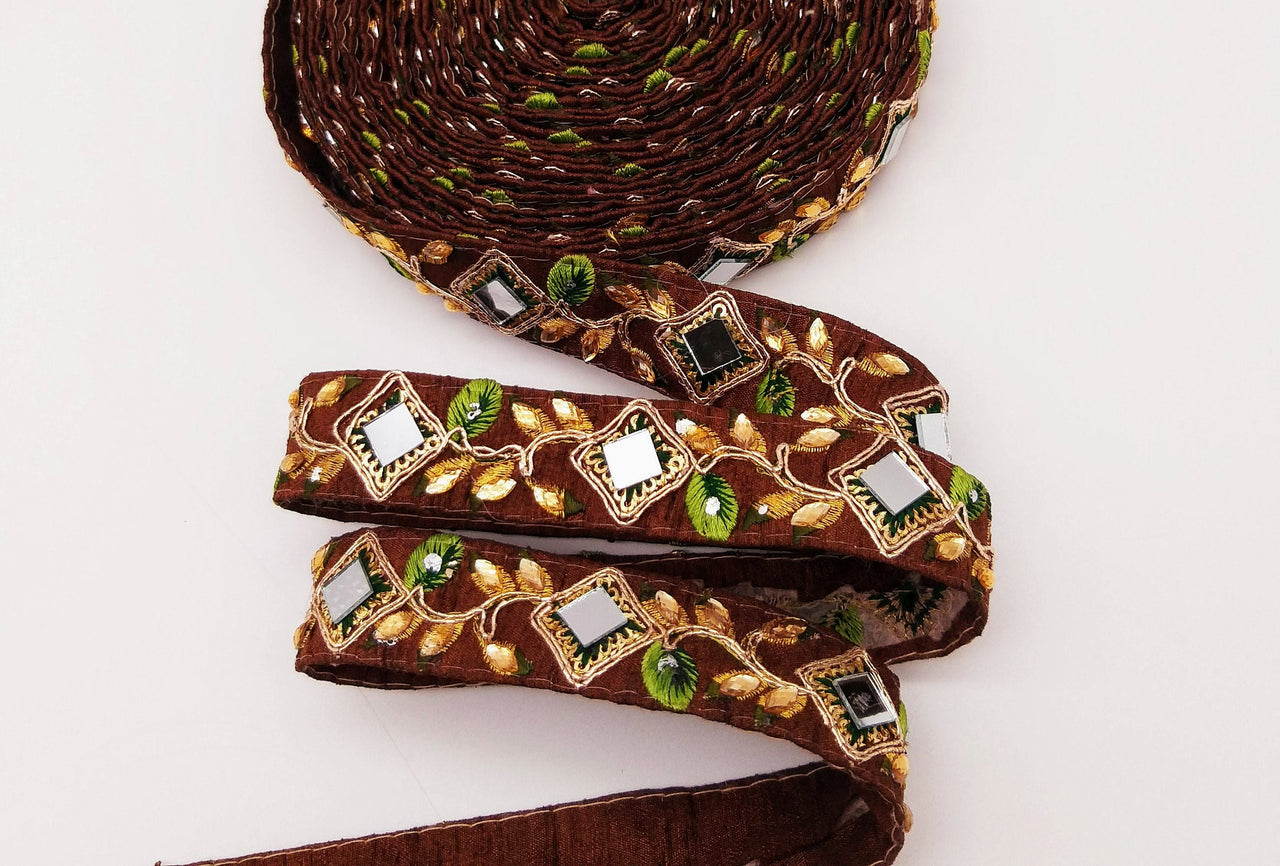 Brown Silk Trim With Mirrors Embellishments and Floral Embroidery, Approx. 26mm Wide, Decorative Trim Costume Trim Fashion Trim By Yard