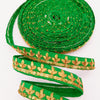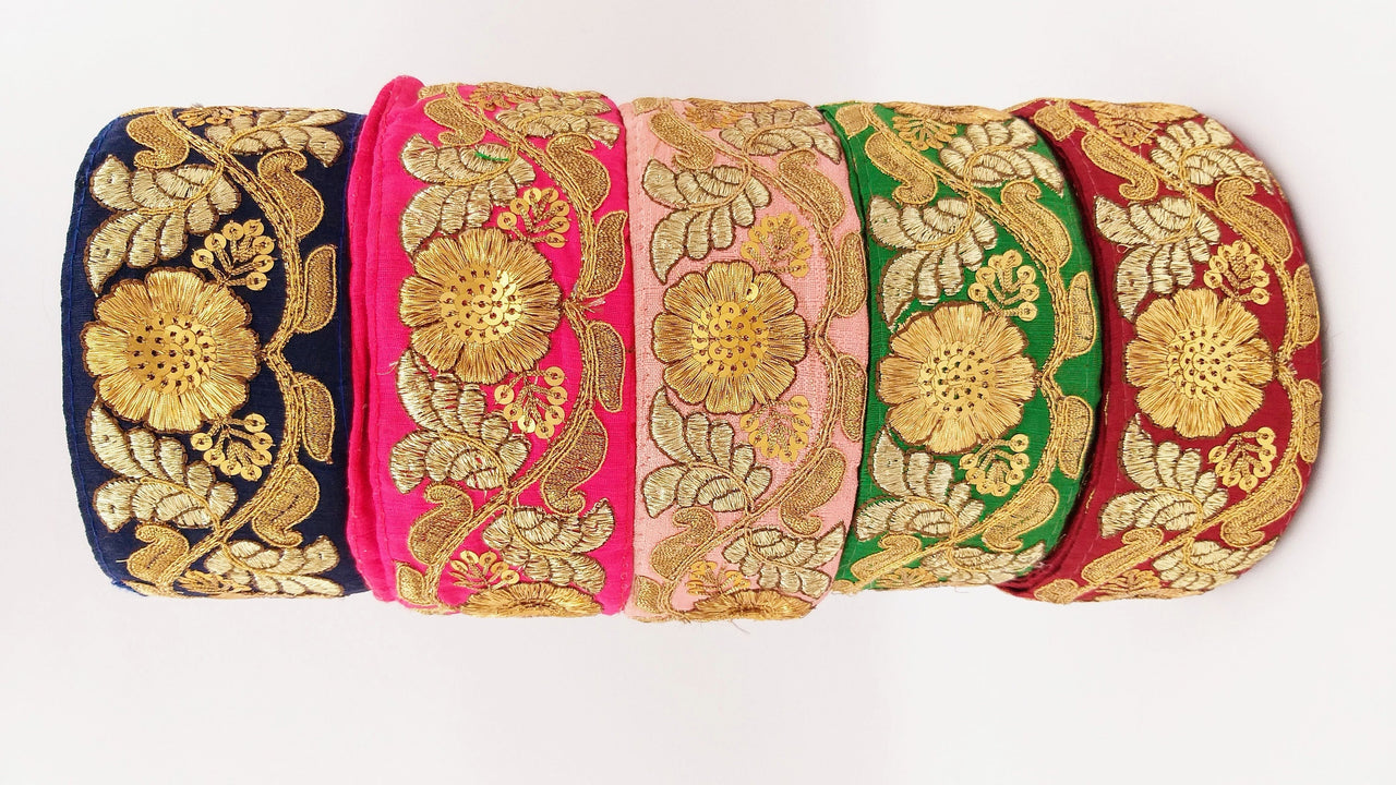 The embroidery on this trim is called Zardozi, an exclusive type of embroidery that is done by hand. Zardozi comes from two Persian words: zar or zarin meaning 'gold', and dozi meaning 'sewing'. Zardozi is a type of heavy and elaborate metal embroidery on a silk, satin, or velvet fabric base.