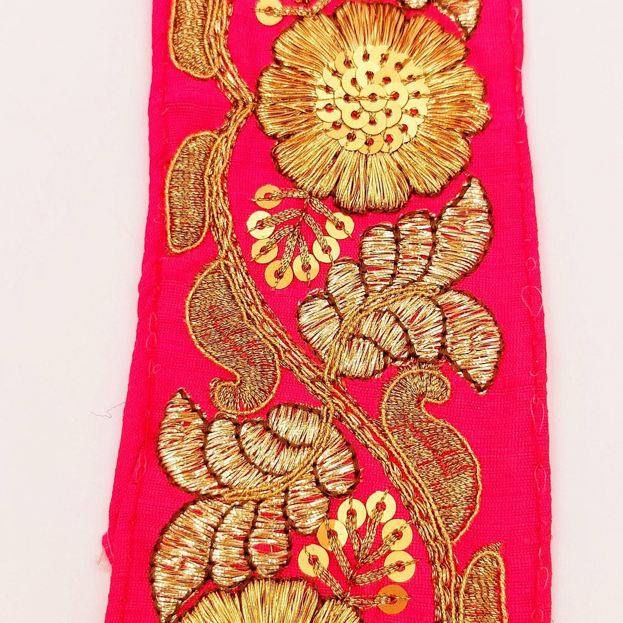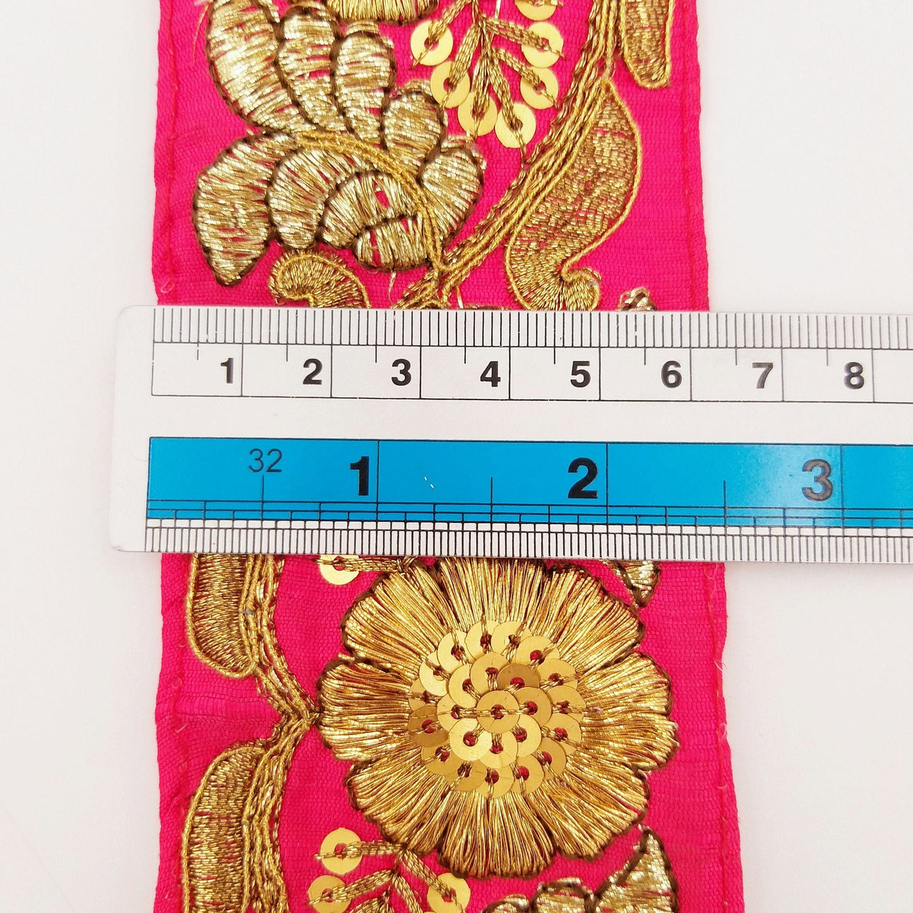 Fuchsia Pink Art Silk Trim In Gold Floral Embroidery, Gold Embroidered Flowers Border, Floral Trim