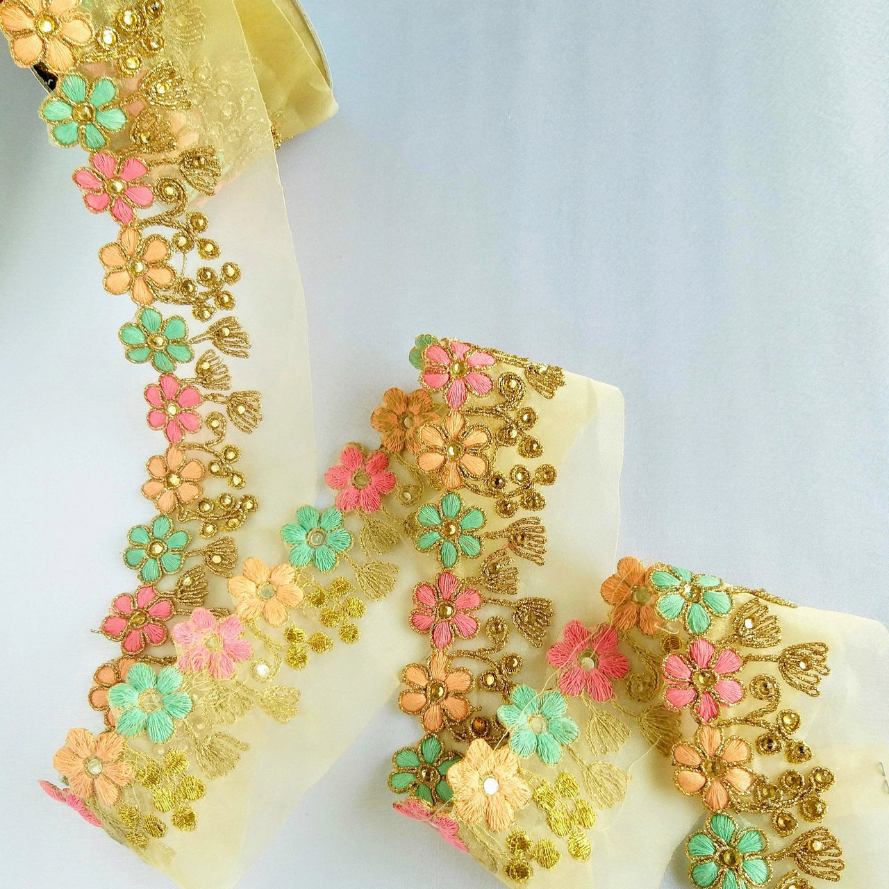 Gold Sheer Tissue Fabric Trim With Embroidered Pastel Pink, Green & Gold Flowers, Embellished With Beads