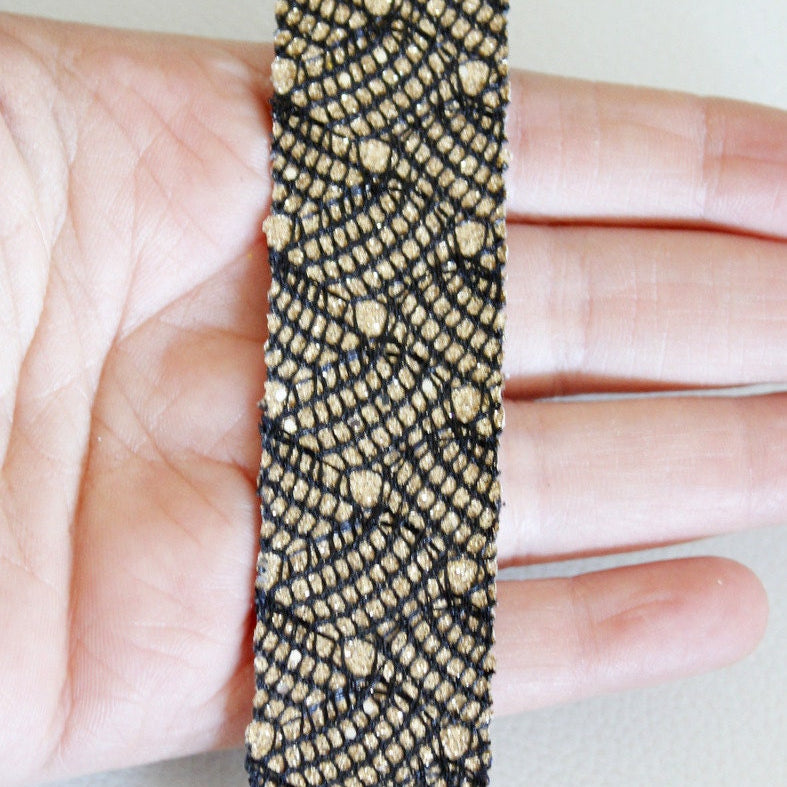 Gold Trim With Black Embroidery, Embroidered Fabric Lace Trim, Approx. 22mm Wide
