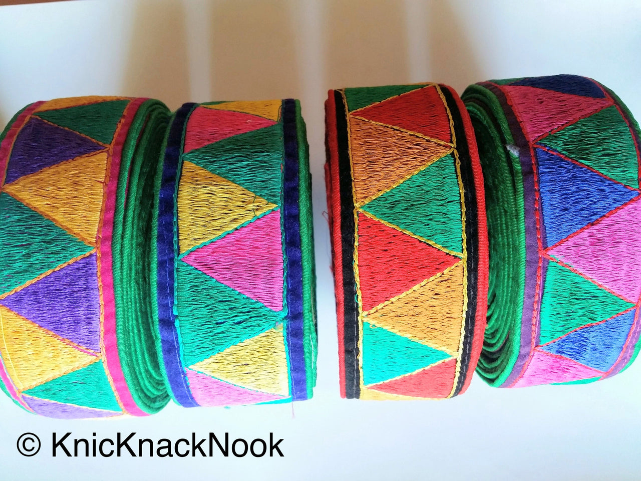 Green And Pink Fabric Trim With Green, Yellow And Purple Temple Border Embroidery Lace Trim, Approx. 50mm Wide - 200317L177