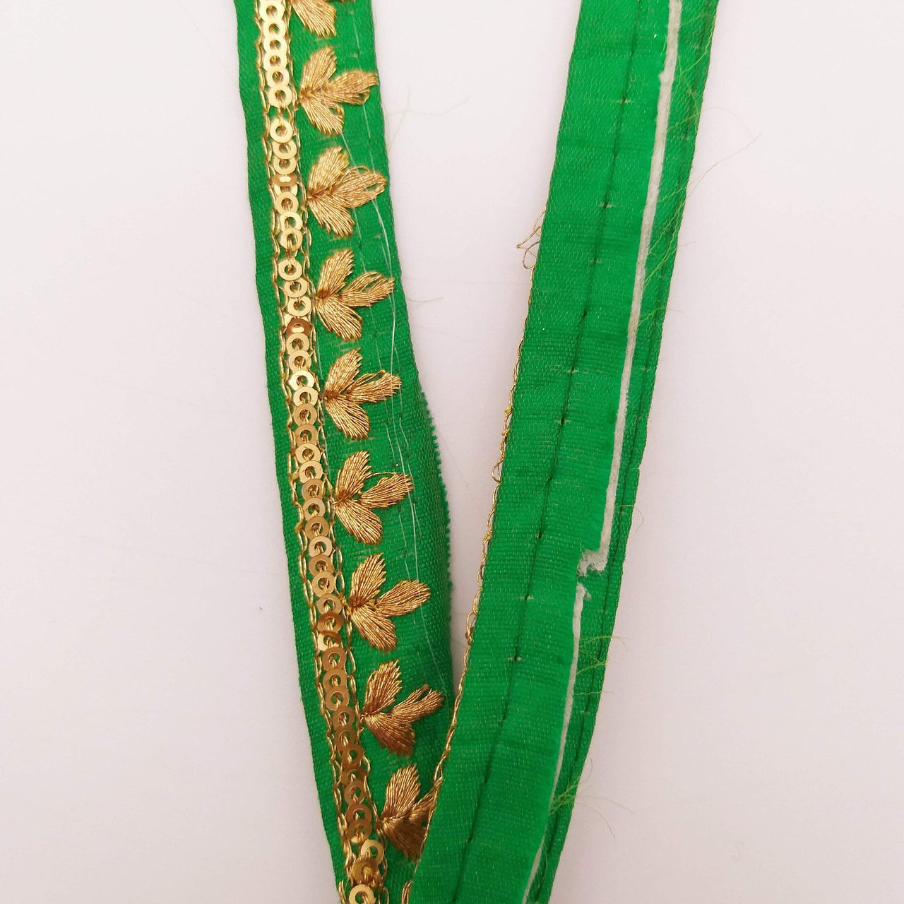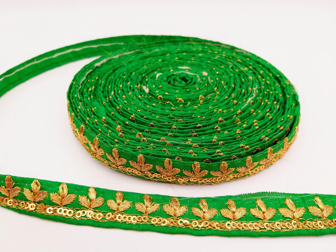 Green Art Silk Trim with Gold Floral Embroidery and Gold Sequins Indian Sari Border Trim By 3 Yards Decorative Trim Craft Lace
