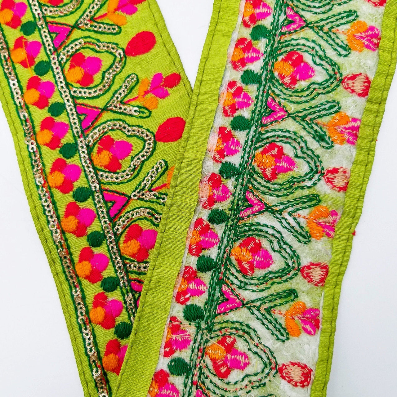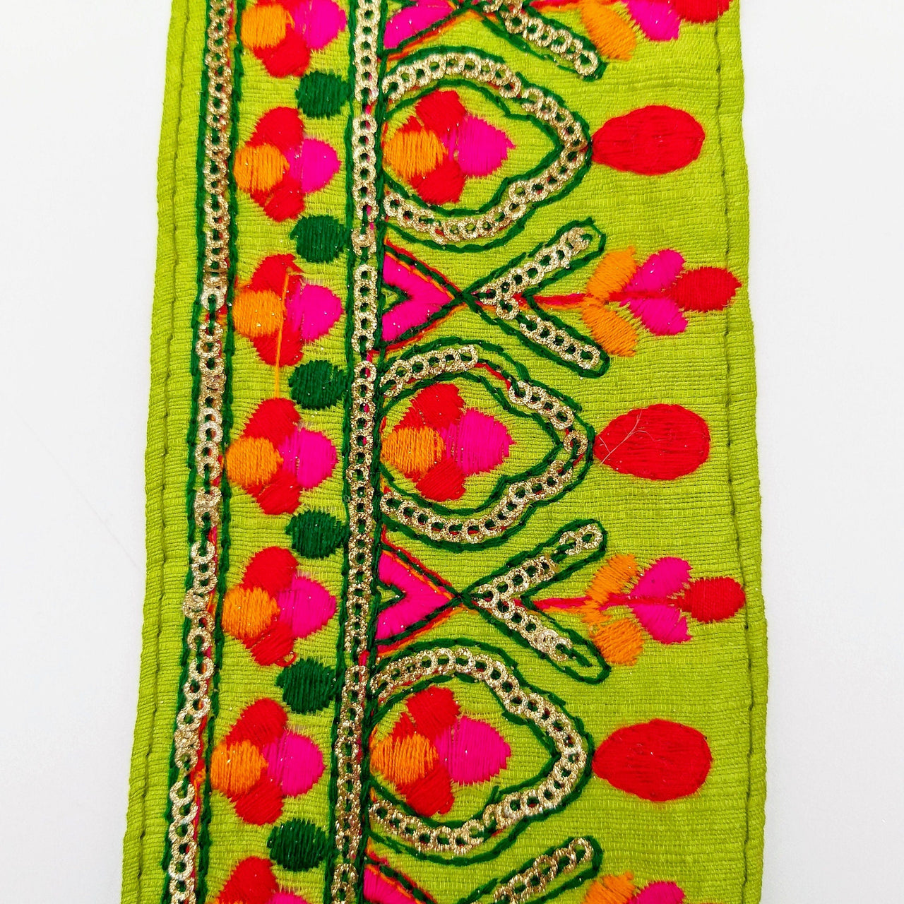Green Fabric Trim With Green, Fuchsia Pink, Red And Yellow Embroidery and Gold Sequins