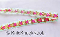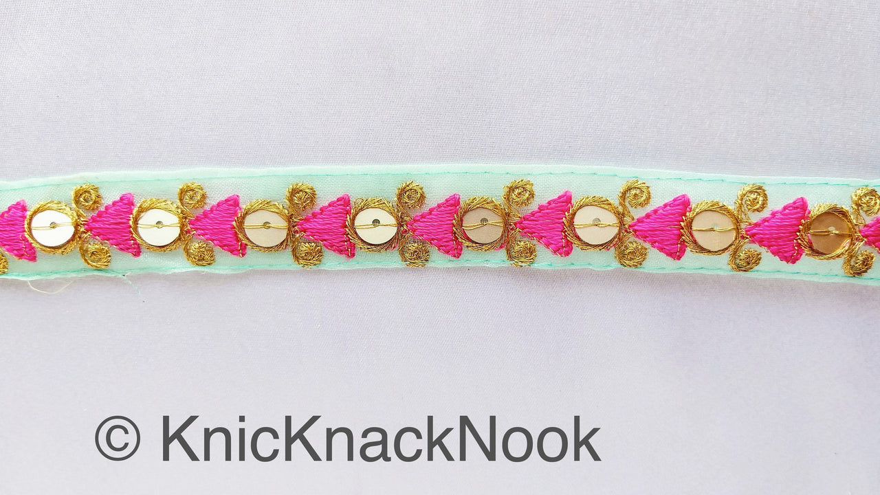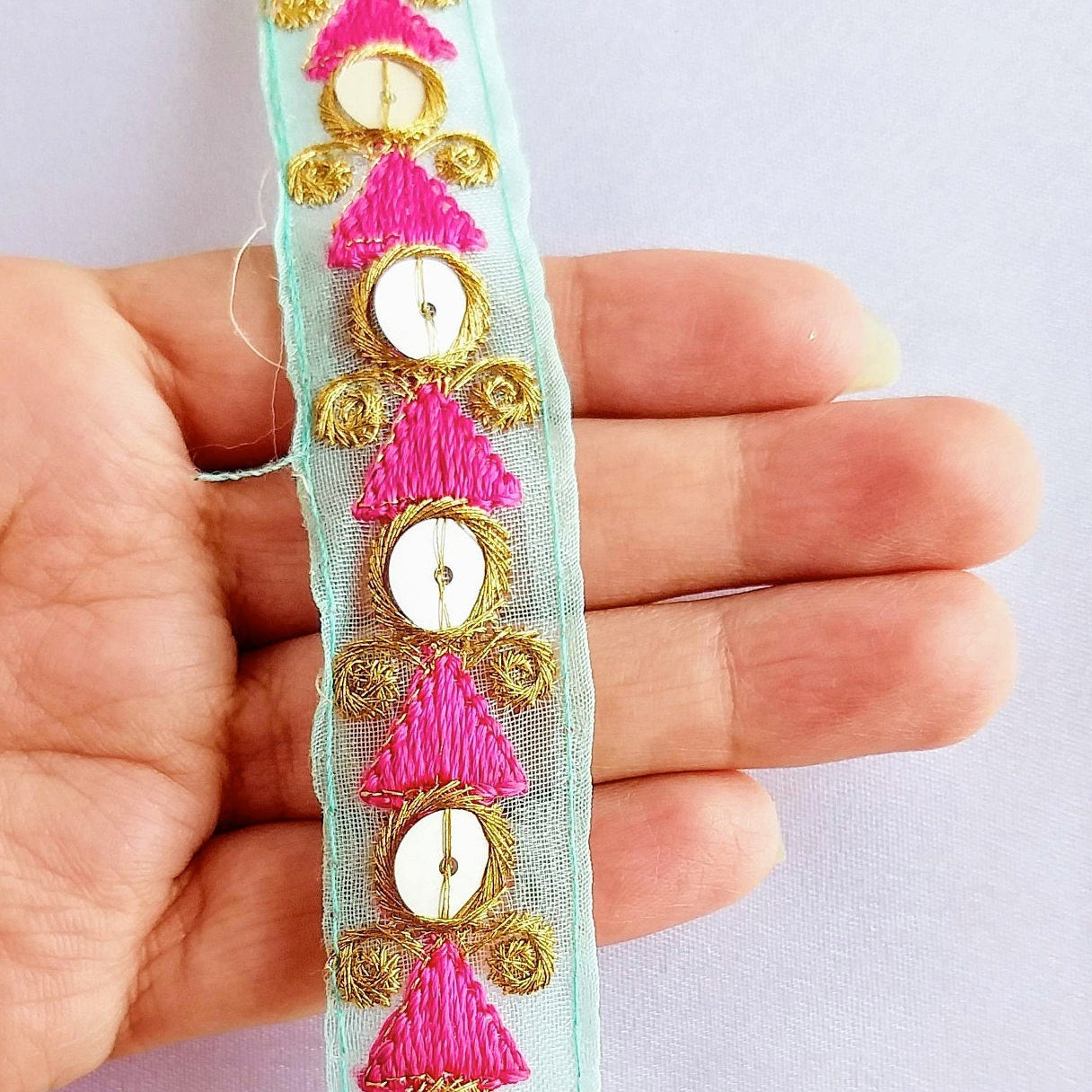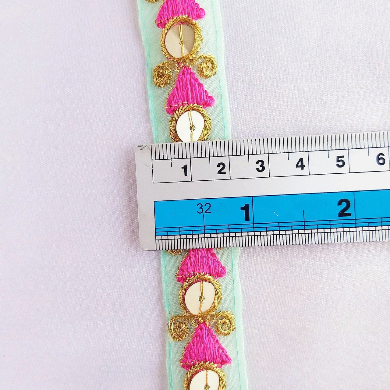 Mint Green Tissue Fabric Trim In Pink & Gold Embroidery With Gold Sequins, , Lace Trim By 2 Yards Indian Decorative Trim