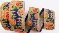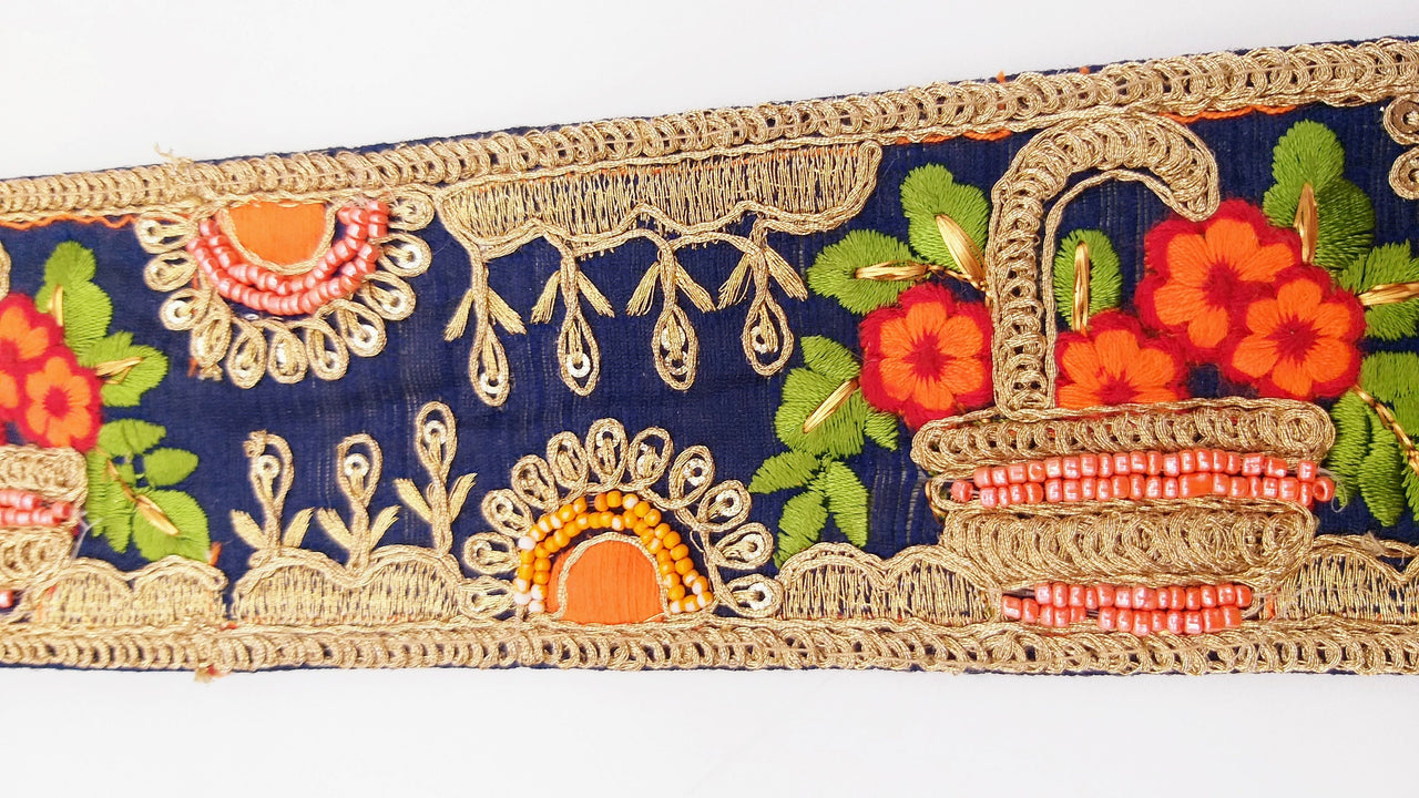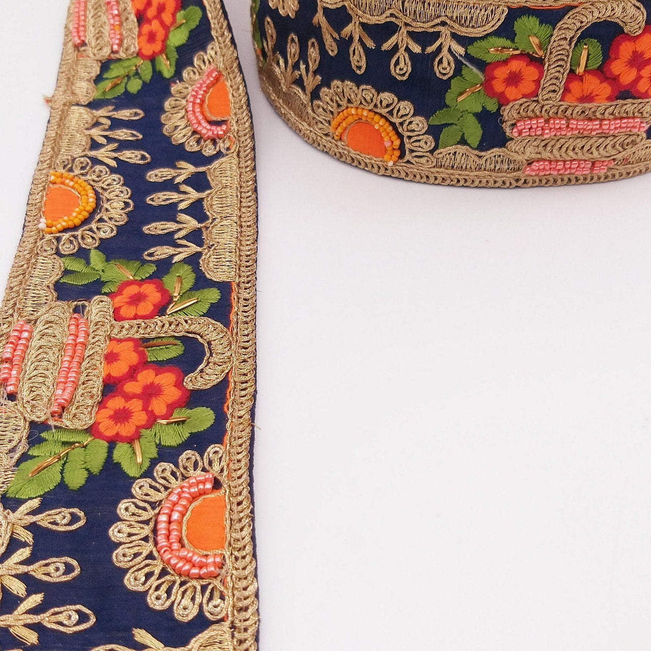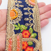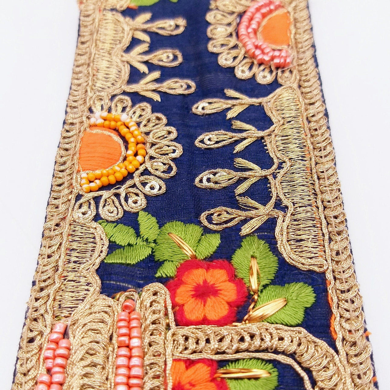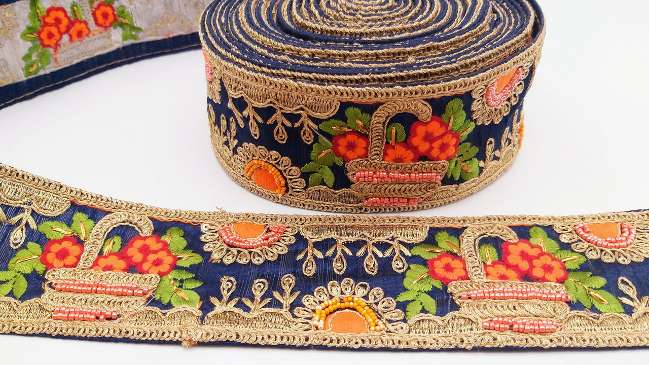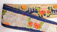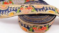 Navy Blue Art Silk Fabric Trim With Green, Orange, Red And Gold Floral Embroidery