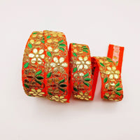 Orange Fabric Trim In Green & Gold Floral Embroidery, Gota Patti Trim, Indian Flower Border