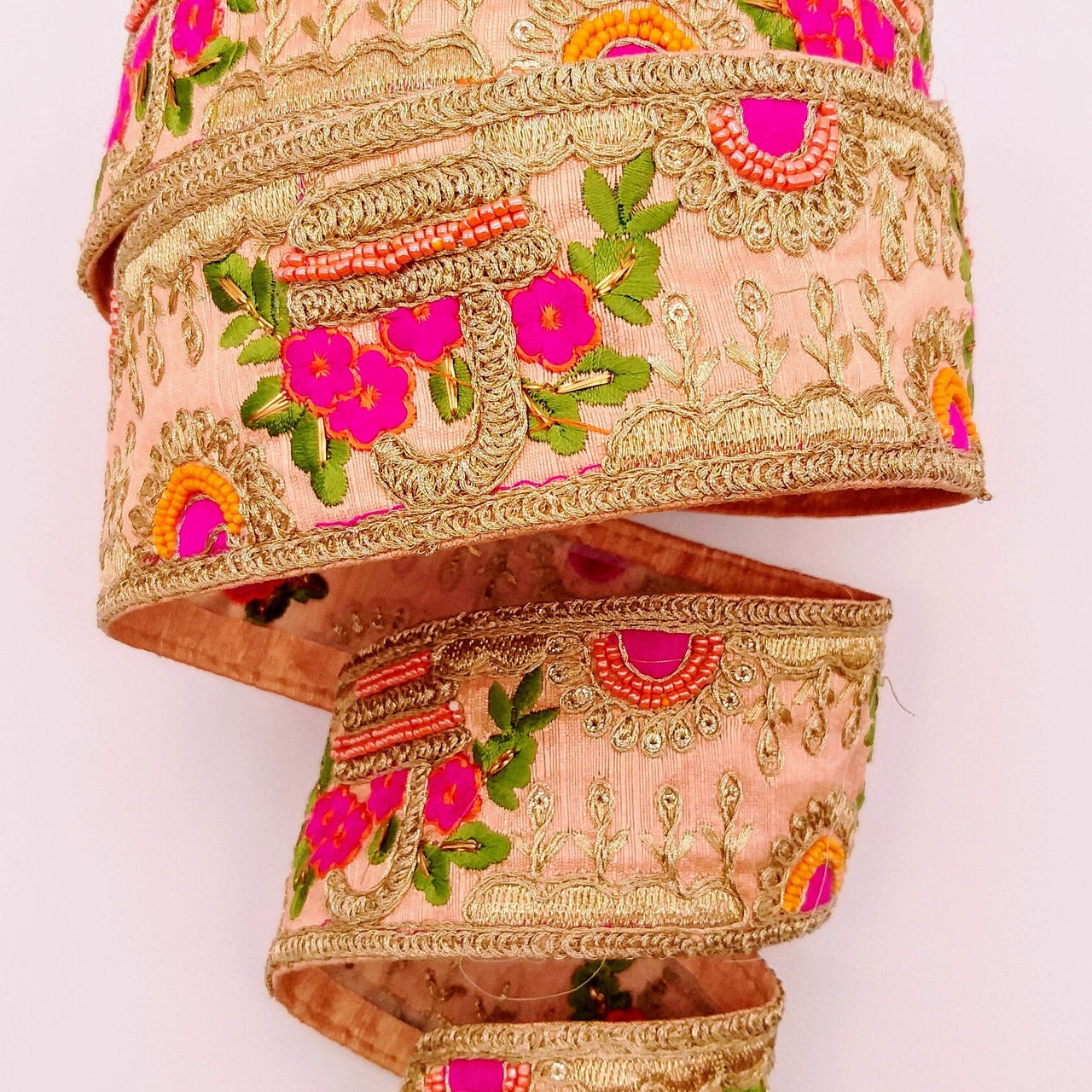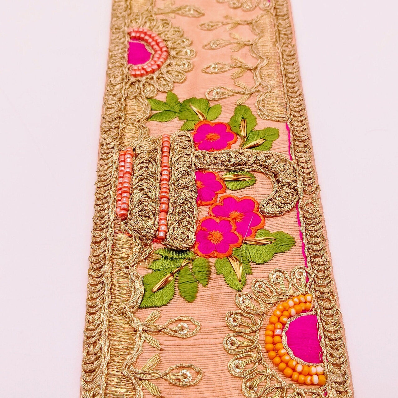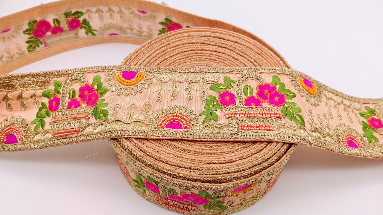 Peach Art Silk Fabric Trim With Green, Orange, Fuchsia Pink And Gold Floral Embroidery