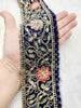 The embroidery on this trim is called Zardozi, an exclusive type of embroidery that is done by hand. Zardozi comes from two Persian words: zar or zarin meaning 'gold', and dozi meaning 'sewing'. Zardozi is a type of heavy and elaborate metal embroidery on a silk, satin, or velvet fabric base.