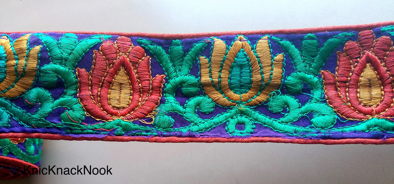 Red Fabric With Purple Velvet Trim With Green, Red And Orange Thread Embroidery, Approx. 65mm Wide - 200317L187