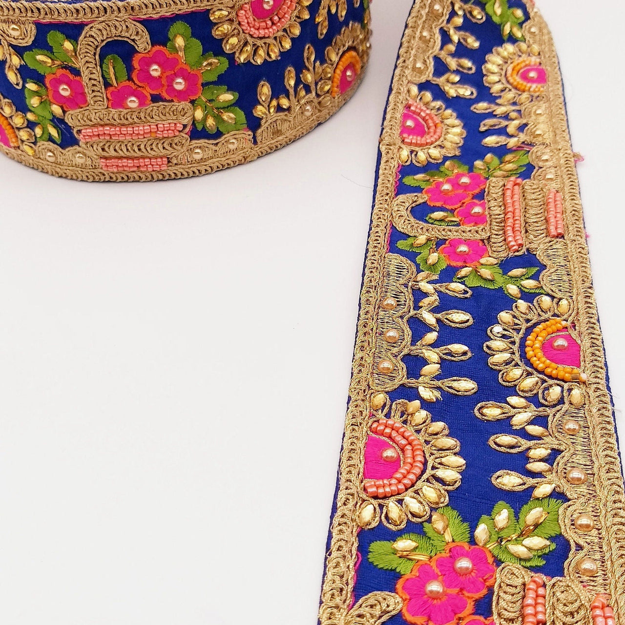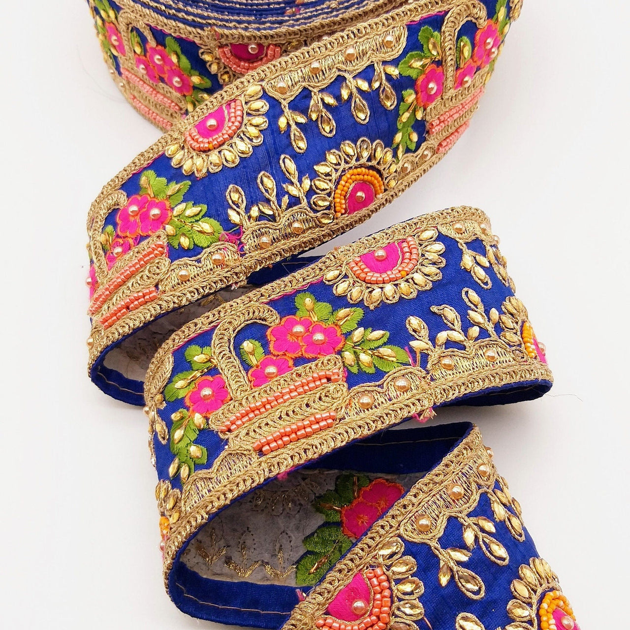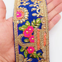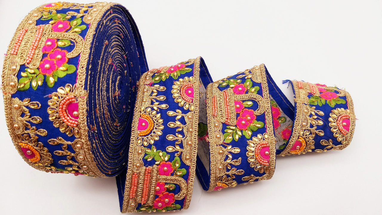 Royal Blue Art Silk Fabric Trim With Green, Orange, Pink And Gold Floral Embroidery