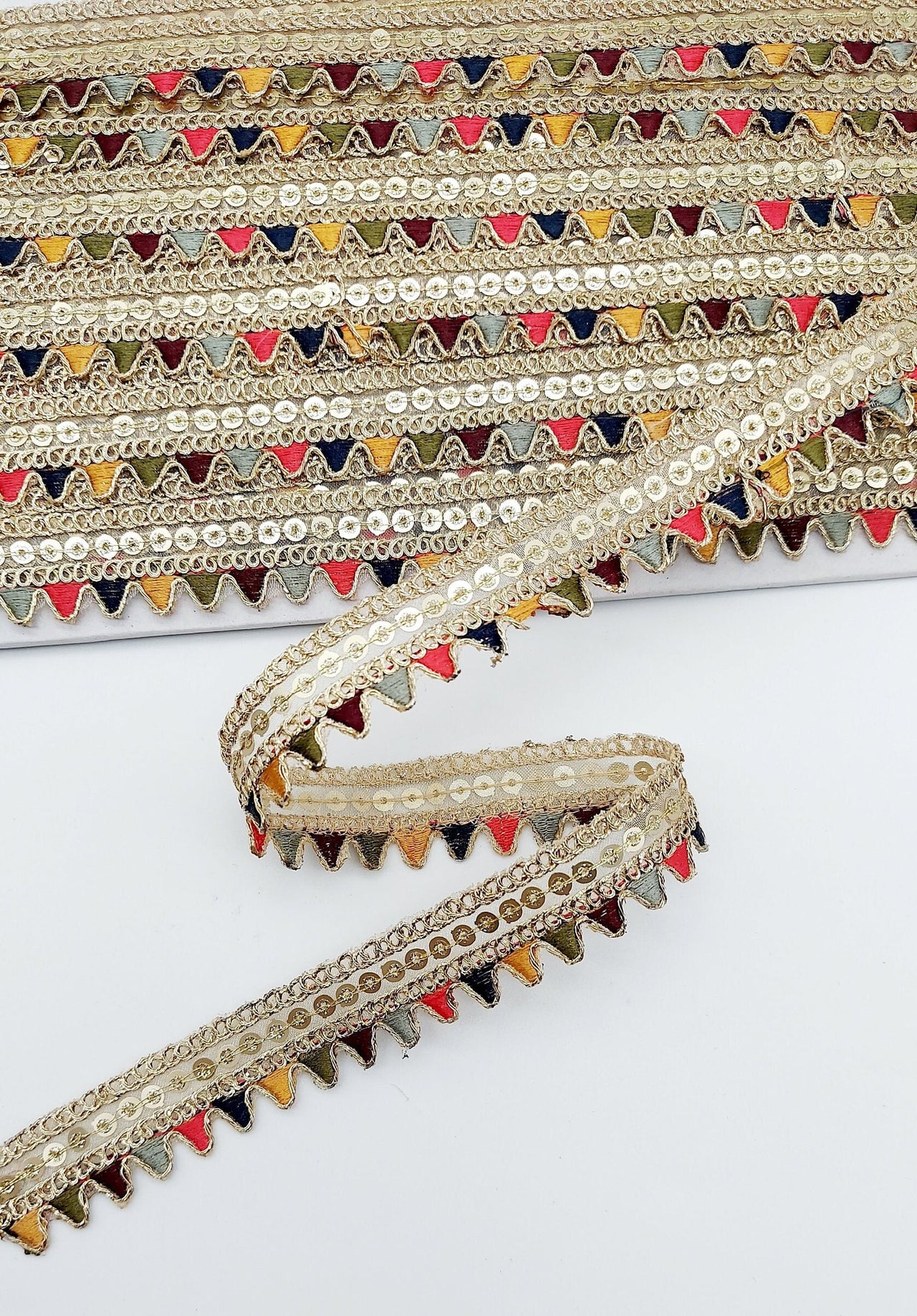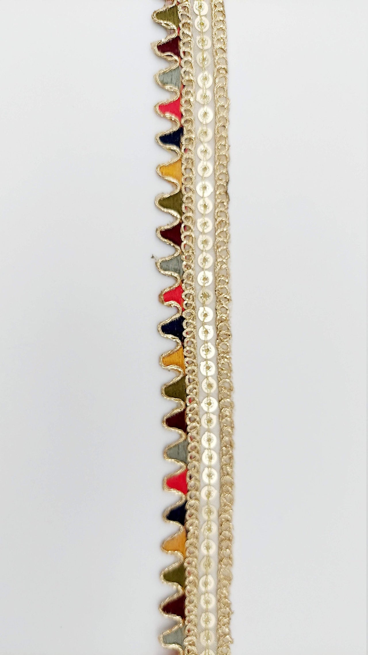The embroidery on this trim is called Zardozi, an exclusive type of embroidery that is done by hand. Zardozi comes from two Persian words: zar or zarin meaning 'gold', and dozi meaning 'sewing'. Zardozi is a type of heavy and elaborate metal embroidery on a silk, satin, or velvet fabric base.