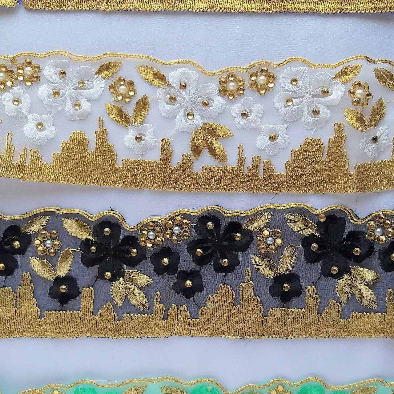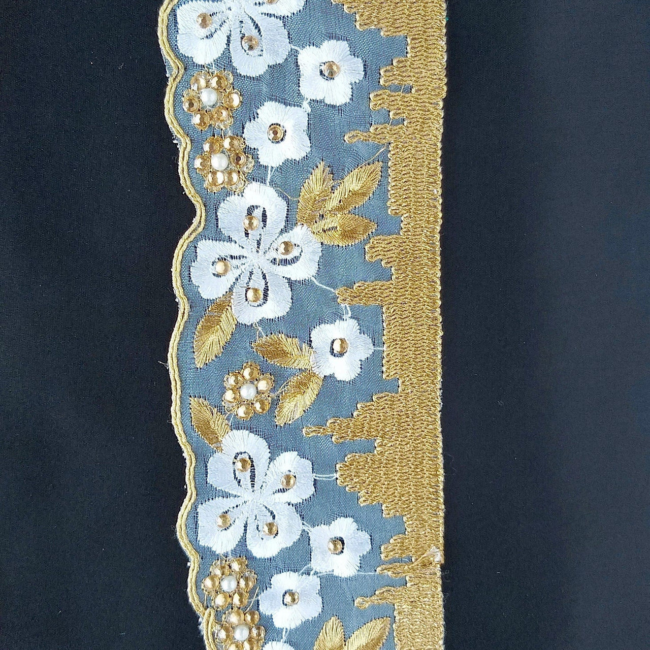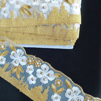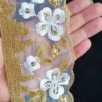 White Tissue Fabric Trim With Embroidered White & Gold Embroidery, Embellished With Beads, Brasso Trim
