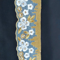 The embroidery on this trim is called Zardozi, an exclusive type of embroidery that is done by hand. Zardozi comes from two Persian words: zar or zarin meaning 'gold', and dozi meaning 'sewing'. Zardozi is a type of heavy and elaborate metal embroidery on a silk, satin, or velvet fabric base.